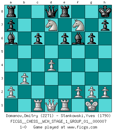 Last move : 1-0 2010 January 16 21:20:2 [Event "FICGS__CHESS__WCH_STAGE_1_GROUP_01__000007"] [Site "FICGS"] [Date "2009.11.02"] [Round "1"] [White "Domanov,Dmitry"] [Black "Stankowski,Yves"] [Result "1-0"] [WhiteElo "2271"] [BlackElo "1790"] 1.e4 c5 2.Nf3 Nc6 3.Bb5 g6 4.O-O Bg7 5.c3 e6 6.d4 cxd4 7.cxd4 d5 8.Nc3 dxe4 9.Bxc6+ bxc6 10.Nxe4 Ne7 11.b3 O-O 12.Ba3 Ba6 13.Re1 Kh8 14.Rc1 Qd7 15.Ne5 Qc7 16.Bd6 Qb7 17.Nc5 Qb6 18.Bxe7 Rfe8 19.Bg5 f6 20.Bxf6 Bxf6 21.Ncd7 Qd8 22.Nf7+ 1-0 Sicilian : Nimzovich-Rossolimo attack (with ...g6, without ...d6) Kingside Castling by player White (move 4) Kingside Castling by player Black (move 11) Player White won this chess game. Follow this game move after move (download)To avoid losing a piece, many a person has lost the game. (Savielly Tartakover) Auf Remis zu spielen ist gewissermaßen ein Verbrechen gegen das Schachspiel. (Mikhail Nekhemyevich Tal) Aquel que ve no otra dirección en el juego que la de dar Jaque Mate a su oponente, nunca será un buen jugador de Ajedrez. (Euwe) C'est une question de caractère, Beaucoup de gens perdent leur motivation très vite. D'autres, ils sont rares, peuvent la conserver très longtemps. J'aime les échecs, encore aujourd'hui je suis heureux d'analyser des parties. J'aime toujours gagner, je déteste encore perdre. Bien jouer est important pour mon intégrité intellectuelle et morale. Et puis les échecs vivent en ce moment une période historique grâce à Internet. Ils se développent dans les systèmes éducatifs à travers le monde. Ils sortent de leur ghetto, et c'est mon rôle de mener à bien cette révolution. (Gary Kasparov) There's no money in correspondence chess. (John Knudsen)