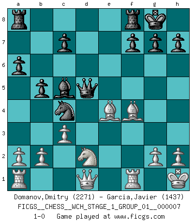 Last move : 1-0 2010 January 9 11:30:59 [Event "FICGS__CHESS__WCH_STAGE_1_GROUP_01__000007"] [Site "FICGS"] [Date "2009.11.02"] [Round "1"] [White "Domanov,Dmitry"] [Black "Garcia,Javier"] [Result "1-0"] [WhiteElo "2271"] [BlackElo "1437"] 1.e4 e5 2.Nf3 Nc6 3.Bb5 Nf6 4.O-O Nxe4 5.d4 a6 6.Ba4 b5 7.Bb3 d5 8.dxe5 Be6 9.Be3 Be7 10.c3 O-O 11.Nbd2 Na5 12.Bc2 Bf5 13.Nd4 Qd7 14.Nxf5 Qxf5 15.f3 Qxe5 16.fxe4 Nc4 17.Bf4 Bc5+ 18.Kh1 Qe6 19.exd5 Qxd5 20.Be4 1-0 Ruy Lopez : Berlin defense, Rosenthal variation Kingside Castling by player White (move 4) Kingside Castling by player Black (move 10) Player White won this chess game. Follow this game move after move (download)I'd rather have a Pawn than a finger. (Reuben Fine) Obwohl ich alt bin, darf mir niemand den Finger in den Mund stecken, sonst beisse ich. (Wilhelm Steinitz) Todavía soy una víctima del Ajedrez. Tiene toda la belleza del arte y mucho mas. No puede ser comercializado. El Ajedrez es mas puro que el arte en su posición social. (Marcel Duchamp) Avec des compensations pour le matériel en plus... (Anonyme) No man has ever achieved immortality in his own life time. (Unknown)