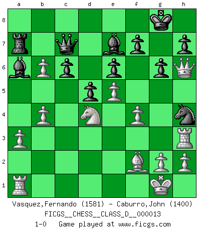 Last move : 1-0 2006 November 27 1:31:26 [Event "FICGS__CHESS__CLASS_D__000013"] [Site "FICGS"] [Date "2006.10.02"] [Round "1"] [White "Vasquez,Fernando"] [Black "Caburro,John"] [Result "1-0"] [WhiteElo "1581"] [BlackElo "1400"] 1.e4 c6 2.d4 d5 3.e5 c5 4.dxc5 Nc6 5.Bb5 Bf5 6.Nf3 a6 7.Bxc6+ bxc6 8.Nd4 Bd7 9.c3 e6 10.b4 a5 11.a3 axb4 12.cxb4 Ne7 13.O-O Ng6 14.f4 Be7 15.Nc3 Qc7 16.Na4 O-O 17.Nb6 Ra7 18.Qh5 Bc8 19.Rf3 Nh4 20.Rh3 g6 21.Qh6 Ba6 22.Be3 Rb8 23.Bf2 Rxb6 24.cxb6 1-0 Caro-Kann : Advance variation Kingside Castling by player White (move 13) Kingside Castling by player Black (move 16) Player White won this chess game. Follow this game move after move (download)The hallmark of the artist is simplicity. (Larry Evans) Mein erstes Ziel war nicht, die Partie zu gewinnen, sondern eine Figur zu opfern. -- der junge (Wilhelm Steinitz) El ganar no lo es todo... pero el perder es nada. (Mednis) On croit qu'il y a plus de mauvais joueurs que de bons joueurs, c'est faux : Il y a autant de joueurs qui gagnent que de joueurs qui perdent. (Philippe Geluck) Either move or be moved. (Ezra Pound)