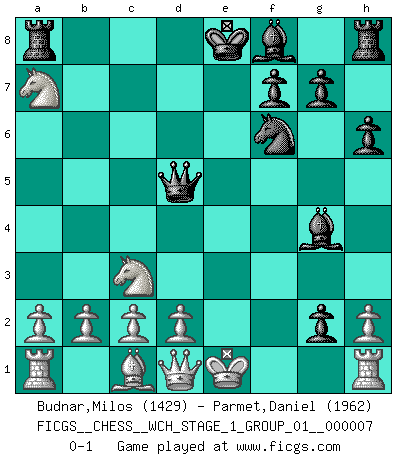 Last move : 0-1 2009 November 18 7:46:10 [Event "FICGS__CHESS__WCH_STAGE_1_GROUP_01__000007"] [Site "FICGS"] [Date "2009.11.02"] [Round "1"] [White "Budnar,Milos"] [Black "Parmet,Daniel"] [Result "0-1"] [WhiteElo "1429"] [BlackElo "1962"] 1.e4 e5 2.Nf3 Nc6 3.Bc4 Nf6 4.Ng5 d5 5.exd5 Na5 6.Bb5+ c6 7.dxc6 bxc6 8.Ba4 h6 9.Nf3 e4 10.Ne5 Qd4 11.Bxc6 Nxc6 12.Nxc6 Qd5 13.Nxa7 Bg4 14.f3 exf3 15.Nc3 fxg2 0-1 Two knights defense Player Black won this chess game. Follow this game move after move (download)The winner of the game is the player who makes the next-to-last mistake. (Savielly Tartakover) Mit Schach schule ich mein Gefühl für Geometrie, was für Tennis und Schach gleichermaßen wichtig ist. (Boris Becker) Vive, pierde y aprende al observar a tu oponente como ganar. (Amber Steenbock) Les Cavaliers se révèlent fort utiles dans les positions fermées. D'habitude, les Fous sont un peu plus forts que les Cavaliers dans les positions ouvertes. Qu'on le veuille ou non, il restera toujours des exceptions ! I find television to be very educating. Every time somebody turns on the set, I go in the other room and read a book. (Groucho Marx)