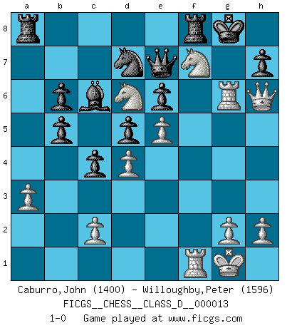 Last move : 1-0 2006 October 14 10:27:29 [Event "FICGS__CHESS__CLASS_D__000013"] [Site "FICGS"] [Date "2006.10.02"] [Round "1"] [White "Caburro,John"] [Black "Willoughby,Peter"] [Result "1-0"] [WhiteElo "1400"] [BlackElo "1596"] 1.e4 e6 2.d4 d5 3.Nc3 Nf6 4.Bg5 Be7 5.e5 Nfd7 6.Bxe7 Qxe7 7.f4 O-O 8.Qd2 b6 9.Nf3 c5 10.Nb5 Na6 11.Nd6 Nb4 12.a3 Nc6 13.Bb5 Na5 14.b3 f6 15.O-O fxe5 16.fxe5 c4 17.b4 Nb7 18.Bc6 Rb8 19.Bxb7 Bxb7 20.Ng5 Bc6 21.b5 Bb7 22.Ngf7 a6 23.Rf3 axb5 24.Raf1 Bc6 25.Rg3 g6 26.Qh6 Ra8 27.Rxg6+ 1-0 French : Classical, Steinitz variation Kingside Castling by player Black (move 7) Kingside Castling by player White (move 15) Player White won this chess game. Follow this game move after move (download)Spassky will not be psyched out by Fischer. (Mike Goodall) Ich spiele ehrlich und spiele, um zu gewinnen. Wenn ich verliere nehme ich meine Medizin. (Robert James Fischer) Fischer deseaba darle a los Rusos una sopa de su propia medicina. (Larry Evans) La menace est plus forte que l'exécution. (Aaron Nimzovitch) Without deviation from the norm, progress is not possible. (Frank Zappa)