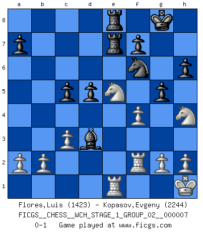 Last move : 0-1 2009 December 25 20:20:11 [Event "FICGS__CHESS__WCH_STAGE_1_GROUP_02__000007"] [Site "FICGS"] [Date "2009.11.02"] [Round "1"] [White "Flores,Luis"] [Black "Kopasov,Evgeny"] [Result "0-1"] [WhiteElo "1423"] [BlackElo "2244"] 1.d4 d5 2.Bg5 h6 3.Bf4 Nf6 4.Nf3 c5 5.dxc5 e6 6.Nbd2 Bxc5 7.e3 O-O 8.Nb3 Bd6 9.Bd3 Nc6 10.Bxd6 Qxd6 11.c3 e5 12.Be2 Bf5 13.O-O Rad8 14.Nh4 Bh7 15.f4 exf4 16.exf4 Qe7 17.Bb5 Qe3+ 18.Kh1 Rfe8 19.Bxc6 bxc6 20.Nd4 c5 21.Nc6 Rd7 22.Ne5 Rde7 23.Rf3 Qe4 24.Qd2 g5 25.Re1 Qc2 26.Qxc2 Bxc2 27.Rf2 Bd3 0-1 Levitsky attack (Queen's Bishop attack) Kingside Castling by player Black (move 7) Kingside Castling by player White (move 13) Player Black won this chess game. Follow this game move after move (download)Human affairs are like a Chess game: only those who do not take it seriously can be called good players. (Hung Tzu Ch'eng) Kombinieren und Schwarzhandel gehören verboten. (Savielly Grigorievitsch Tartakower) Las piezas de Ajedrez son los bloques del alfabeto que moldean los pensamientos; y esos pensamientos, aunque hagan un diseño visual en el tablero, expresan abstractamente su belleza como un poema. (Marcel Duchamp) Dieu déplace le joueur, et celui-ci la pièce. Quel Dieu derrière Dieu commence donc la trame ? Arturo Perez-Reverte (prix de littérature policière 1993). In every real man a child is hidden that wants to play. (Friedrich Nietzsche)