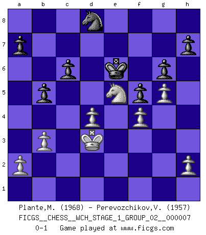 Last move : 0-1 2010 February 26 9:28:25 [Event "FICGS__CHESS__WCH_STAGE_1_GROUP_02__000007"] [Site "FICGS"] [Date "2009.11.02"] [Round "1"] [White "Plante,Marc-Eric"] [Black "Perevozchikov,Vjacheslav"] [Result "0-1"] [WhiteElo "1968"] [BlackElo "1957"] 1.e4 e5 2.Nf3 Nc6 3.Bb5 Nf6 4.O-O Nxe4 5.Re1 Nd6 6.Nxe5 Be7 7.Bf1 O-O 8.d4 Nf5 9.c3 Nxe5 10.Rxe5 d6 11.Re1 c6 12.Bd3 d5 13.Bf4 Bd6 14.Bxd6 Nxd6 15.Nd2 Bf5 16.Bxf5 Nxf5 17.Qg4 Nd6 18.Re2 Qc7 19.Rae1 Rae8 20.Qg3 f6 21.Rxe8 Rxe8 22.Rxe8+ Nxe8 23.Qxc7 Nxc7 24.f4 g6 25.Kf2 Kf7 26.Ke3 Nb5 27.g4 Nd6 28.b3 Ke6 29.c4 dxc4 30.Nxc4 Nf7 31.Kd3 f5 32.g5 b5 33.Ne5 Nd8 0-1 This chess game has been lost on time (started : 2009.11.02 22:14:27) Ruy Lopez : Berlin defense, Open variation Kingside Castling by player White (move 4) Kingside Castling by player Black (move 7) Player Black won this chess game. Follow this game move after move (download)The enormous mental resilience, without which no Chess player can exist, was so much taken up by Chess that he could never free his mind of this game. (Albert Einstein) Bis zum Jahr 1971 verlief in meiner Schachkariere alles glatt. Dieses dramatische Match [Fischer-Taimanov 6:0] machte mein Leben zur Hölle. (Mark Taimanov) Solo los afeminados hacen el Enroque. (Rob Sillars) Votre seul travail dans les ouvertures est d'obtenir un milieu de partie jouable. (Lajos Portish) An expert is a man who has made all the mistakes which can be made in a very narrow field. (Niels Bohr)