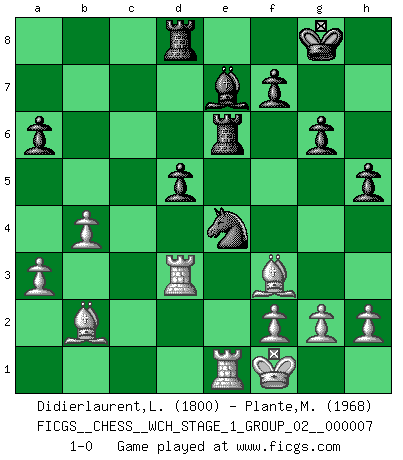 Last move : 1-0 2010 February 17 8:53:11 [Event "FICGS__CHESS__WCH_STAGE_1_GROUP_02__000007"] [Site "FICGS"] [Date "2009.11.02"] [Round "1"] [White "Didierlaurent,Ludovic"] [Black "Plante,Marc-Eric"] [Result "1-0"] [WhiteElo "1800"] [BlackElo "1968"] 1.e4 c5 2.Nf3 d6 3.d4 cxd4 4.Nxd4 Nf6 5.Nc3 a6 6.Be2 e6 7.O-O Be7 8.Qd3 Nc6 9.Nxc6 bxc6 10.Qg3 O-O 11.Be3 Nd7 12.Rad1 d5 13.Na4 Bb7 14.c4 Qa5 15.Nc3 Rfe8 16.exd5 cxd5 17.cxd5 Bxd5 18.Nxd5 exd5 19.a3 g6 20.Qf4 Nf6 21.Qd4 Rab8 22.Rfe1 Bd8 23.Bf3 Re6 24.Bd2 Qb6 25.Bc3 Qxd4 26.Bxd4 Ne4 27.b4 Be7 28.Kf1 Rd8 29.Rd3 h5 30.Bb2 1-0 This chess game has been lost on time (started : 2009.11.02 22:14:27) Sicilian : Najdorf, Opovcensky variation Kingside Castling by player White (move 7) Kingside Castling by player Black (move 10) Player White won this chess game. Follow this game move after move (download)Chess is a fighting game which is purely intellectual and includes chance. (Richard Reti) Korrekt heißt in Deutschland die Haltung eines Mannes, dessen Benehmen nach dem Urteile seiner Nachbarn seiner Stellung angemessen ist. Um korrekt zu sein, muß man sich der Meinung der anderen anpassen... (Emanuel Lasker) Los tropiezos estan todos ahí en el tablero, esperando que se cometan. (Savielly Tartakover) Il s'avisa de me proposer d'apprendre les échecs qu'il jouait un peu... me voilà forcené des échecs. J'achète un échiquier, je m'enferme dans ma chambre, j'y passe des jours et des nuits à vouloir apprendre par cur toutes les parties. (Jean-Jacques Rousseau, Confessions) Experiences are the keys to life. (Daniel Parmet)