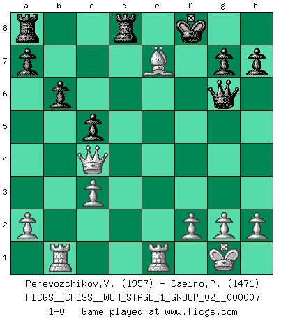 Last move : 1-0 2009 November 15 13:28:24 [Event "FICGS__CHESS__WCH_STAGE_1_GROUP_02__000007"] [Site "FICGS"] [Date "2009.11.02"] [Round "1"] [White "Perevozchikov,Vjacheslav"] [Black "Caeiro,Pedro"] [Result "1-0"] [WhiteElo "1957"] [BlackElo "1471"] 1.d4 Nf6 2.c4 e6 3.Nc3 d5 4.Nf3 c5 5.cxd5 Nxd5 6.e4 Nxc3 7.bxc3 Nc6 8.d5 exd5 9.exd5 Nb8 10.Bb5+ Bd7 11.Bxd7+ Qxd7 12.O-O Be7 13.Ne5 Qd8 14.Rb1 b6 15.Nxf7 Kxf7 16.d6 Nd7 17.dxe7 Qxe7 18.Re1 Qf6 19.Qd5+ Kg6 20.Qxd7 Rhd8 21.Qg4+ Kf7 22.Bg5 Qg6 23.Qc4+ Kf8 24.Be7+ 1-0 Queen's pawn game Kingside Castling by player White (move 12) Player White won this chess game. Follow this game move after move (download)Discovered check is the dive bomber of the Chessboard. (Reuben Fine) Wenn Spassky eine Figur opfert kannst du genauso gut aufgeben. Aber wenn Tal eine Figur opfert, spiel weiter. Er könnte noch eine weitere opfern, und dann ... wer weiß? (Miguel Najdorf) El estómago es una parte esencial del maestro de Ajedrez. (Bent Larsen) On n'a jamais que l'âge auquel on a commence à jouer aux échecs car après on cesse de vieillir. (Capablanca) May the force be with you. (Han Solo in Star Wars ep.4)