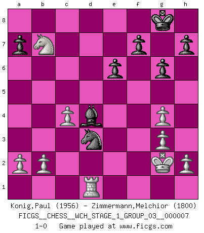 Last move : 1-0 2010 January 27 13:5:58 [Event "FICGS__CHESS__WCH_STAGE_1_GROUP_03__000007"] [Site "FICGS"] [Date "2009.11.02"] [Round "1"] [White "Konig,Paul"] [Black "Zimmermann,Melchior"] [Result "1-0"] [WhiteElo "1956"] [BlackElo "1800"] 1.c4 d6 2.d4 g6 3.Nc3 Bg7 4.Nf3 Nf6 5.g3 O-O 6.Bg2 c5 7.dxc5 dxc5 8.O-O Nc6 9.Qb3 b6 10.Ne5 Nxe5 11.Bxa8 Bh3 12.Bg2 Bxg2 13.Kxg2 Qa8+ 14.f3 Rd8 15.Rd1 Rxd1 16.Nxd1 Nc6 17.Nc3 Nd4 18.Qa4 Ng4 19.Nd5 e6 20.Nxb6 Qb8 21.Nd7 Qa8 22.Nxc5 Nxe2 23.Qb3 Bd4 24.Qb7 Qxb7 25.Nxb7 Nxc1 26.fxg4 Nd3 27.Rd1 1-0 English Opening Kingside Castling by player Black (move 5) Kingside Castling by player White (move 8) Player White won this chess game. Follow this game move after move (download)There are two classes of men; those who are content to yield to circumstances and who play whist; those who aim to control circumstances, and who play Chess. (Mortimer Collins) Man gibt nur Pakete auf. (Paul Keres) Botvinnik trataba de restarle el misterio al Ajedrez, siempre relacionandolo a situaciones de la vida ordinaria. El gustaba de llamar al Ajedrez un típico problema inexacto similar a aquellos de los cuales la gente siempre tiene que enfrentarse en la vida cotidiana. (Garry Kasparov) Les Echecs, c'est l'art de la guerre sans les charniers, c'est la résurrection des morts tombés au champ d'honneur, l'espoir perpétuel, la suprématie de l'intelligence sur la force, la culture de l'esprit. (F. Szpiner) They say poker is a zero-sum game. It must be, because every time I play my sum ends up zero. (Max Shapiro)