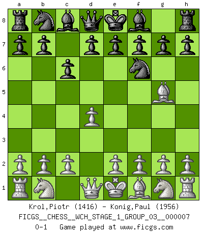 Last move : 0-1 2009 December 7 9:25:10 [Event "FICGS__CHESS__WCH_STAGE_1_GROUP_03__000007"] [Site "FICGS"] [Date "2009.11.02"] [Round "1"] [White "Krol,Piotr"] [Black "Konig,Paul"] [Result "0-1"] [WhiteElo "1416"] [BlackElo "1956"] 1.d4 Nf6 2.Bg5 c6 0-1 This chess game has been lost on time (started : 2009.11.02 22:16:13) Trompowsky attack (Ruth, Opovcensky Opening) Player Black won this chess game. Follow this game move after move (download)You are for me the Queen on d8 and I am the Pawn on d7 !! (Eduard Gufeld) Matt entspricht nicht immer den Tatsachen. (Savielly Grigorievitsch Tartakower) La estratégia requiere pensar, la táctica requiere observación. (Max Euwe) Si rien de grave n'est détecté lors de l'analyse d'une position, on joue alors le coup. Seconde règle de Blumenfeld. Have no fear of perfection - you'll never reach it. (Salvador Dali)