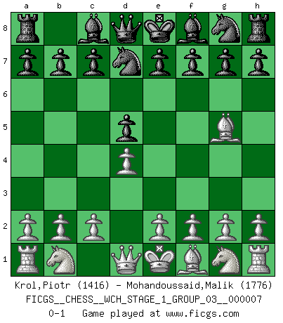 Last move : 0-1 2009 December 6 21:19:3 [Event "FICGS__CHESS__WCH_STAGE_1_GROUP_03__000007"] [Site "FICGS"] [Date "2009.11.02"] [Round "1"] [White "Krol,Piotr"] [Black "Mohandoussaid,Malik"] [Result "0-1"] [WhiteElo "1416"] [BlackElo "1776"] 1.d4 d5 2.Bg5 Nd7 0-1 This chess game has been lost on time (started : 2009.11.02 22:16:13) Levitsky attack (Queen's Bishop attack) Player Black won this chess game. Follow this game move after move (download)White lost because he failed to remember the right continuation and had to think up the moves himself. (Siegbert Tarrasch) Es genügt nicht ein guter Spieler zu sein, man muß auch gut spielen. (Siegbert Tarrasch) El Ajedrez es parte de una cultura y si una cultura esta en decadencia, entonces también el Ajedrez declinará. (Mikhail Botvinnik) Echiquier : carré parfait, comme la Jérusalem nouvelle décrite par l'auteur de l'Apocalypse, huit cases sur huit, exaltation du chiffre 4, symbole du cosmos aux quatre horizons... où le noir et le blanc, l'ombre et la lumière, le mal et le bien s'entremêlent et se conjuguent. (Robert Couffignal, Le Gambit du poète) If only people were all showed a certain minimum level of niceness; if only people didn't retract verbal draw offers (without draw box ticked) on ficgs; if only people didn't kill; if only people didn't run concentration / extermination camps, if only people didn't drop nuclear bombs on Hiroshima and Nagasaki, and so on - it would be a much more beautiful world. But sadly, things are not so... (Normajean Yates)