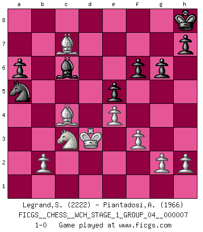 Last move : 1-0 2010 January 10 23:50:28 [Event "FICGS__CHESS__WCH_STAGE_1_GROUP_04__000007"] [Site "FICGS"] [Date "2009.11.17"] [Round "1"] [White "Legrand,Stephane"] [Black "Piantadosi,Angelo"] [Result "1-0"] [WhiteElo "2222"] [BlackElo "1966"] 1.d4 Nf6 2.Nf3 d5 3.c4 dxc4 4.Nc3 e6 5.e4 c5 6.Bxc4 cxd4 7.Qxd4 Qxd4 8.Nxd4 a6 9.O-O Be7 10.Be3 b5 11.Be2 Bb7 12.f3 Nc6 13.Nb3 O-O 14.Rfd1 Rfd8 15.Nc5 Bxc5 16.Bxc5 Rxd1+ 17.Rxd1 Rd8 18.Rxd8+ Nxd8 19.a4 bxa4 20.Kf2 Nd7 21.Bd6 f6 22.Nxa4 Nc6 23.Ke3 e5 24.Bc4+ Kh8 25.Bd5 Na5 26.Ba2 Bc6 27.Nc3 Nb6 28.Kd3 g6 29.Bc7 Nbc4 30.Bxc4 1-0 Queen's pawn game Kingside Castling by player White (move 9) Kingside Castling by player Black (move 13) Player White won this chess game. Follow this game move after move (download)I'm not afraid of Spassky. The world knows I'm the best. You don't need a match to prove it. (Bobby Fischer) Am wohlsten fühle ich mich, wenn ich sehe, wie sich mein Gegner im Todeskampf windet. (Robert James Fischer) Aunque la mayoría de la gente disfruta observar las partidas de los grandes Maestros de ataque, algunos de los jugadores mas notables en la historia han sido los jugadores silenciosos posicionales. Lentamente ellos te aplastan despojandote de tu espacio, congestionando tus piezas y dejandote virtualmente sin nada que hacer. (Yasser Seirawan) Les réformistes prétendent que les progrès de la théorie conduiront à la disparition des échecs, et qu'il faut, pour leur rendre vie, en remanier les règles. En réalité, qu'exprime cette affirmation? Le mépris de l'intuition, de l'imagination et de tous les autres éléments qui font des échecs un art. (Alexander Alekhine) This is where the fun begins. (Anakin Skywalker in Star Wars ep.3)