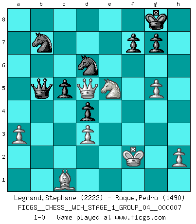 Last move : 1-0 2010 April 29 7:36:53 [Event "FICGS__CHESS__WCH_STAGE_1_GROUP_04__000007"] [Site "FICGS"] [Date "2009.11.02"] [Round "1"] [White "Legrand,Stephane"] [Black "Roque,Pedro"] [Result "1-0"] [WhiteElo "2222"] [BlackElo "1490"] 1.c4 Nf6 2.Nf3 e6 3.b3 d5 4.Bb2 Bd6 5.g3 O-O 6.Bg2 c5 7.O-O d4 8.b4 Re8 9.e3 e5 10.exd4 exd4 11.d3 Qb6 12.Na3 Nc6 13.Nb5 Nxb4 14.a3 Na6 15.Nxd6 Qxd6 16.Bc1 Nc7 17.Bf4 Qd8 18.Rb1 Ne6 19.Bd2 Nd7 20.Re1 Rb8 21.Nh4 b6 22.f4 Nc7 23.Rxe8+ Qxe8 24.Qa4 Qe2 25.Qc2 Bb7 26.Re1 Qg4 27.Bxb7 Rxb7 28.Qa4 b5 29.cxb5 h6 30.b6 Rxb6 31.Qxa7 Rb2 32.Bc1 Rc2 33.Qa4 Ra2 34.Qb3 Re2 35.Qd1 Rxe1+ 36.Qxe1 Nb5 37.Kg2 Nd6 38.Qe7 Nf6 39.Nf3 Nfe8 40.Qe5 Qc8 41.Qd5 Nb7 42.Ne5 Ned6 43.g4 Qe8 44.Kf2 Qb5 45.g5 hxg5 46.fxg5 1-0 This chess game has been lost on time (started : 2009.11.02 22:17:34) English Opening Kingside Castling by player Black (move 5) Kingside Castling by player White (move 7) Player White won this chess game. Follow this game move after move (download)I played Chess with him and would have beaten him sometimes only he always took back his last move, and ran the game out differently. (Mark Twain) Schach verlangt totale Konzentration. (Robert James Fischer) En un gambito tu regalas un Peón por el bién de tomar un juego perdido. (Samuel Standige Boden) Celui qui prend des risques peut perdre, celui qui n'en prend pas perd toujours. (Xavier Tartacover) Whenever people agree with me, I always feel I must be wrong. (Oscar Wilde)