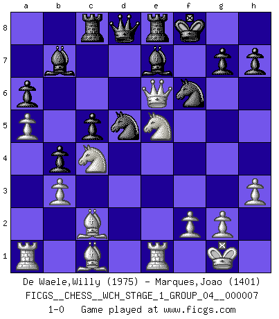 Last move : 1-0 2009 December 2 17:51:26 [Event "FICGS__CHESS__WCH_STAGE_1_GROUP_04__000007"] [Site "FICGS"] [Date "2009.11.02"] [Round "1"] [White "De Waele,Willy"] [Black "Marques,Joao"] [Result "1-0"] [WhiteElo "1975"] [BlackElo "1401"] 1.e4 e5 2.Nf3 Nc6 3.Bb5 a6 4.Ba4 b5 5.Bb3 Nf6 6.O-O Be7 7.Re1 O-O 8.c3 Bb7 9.h3 d6 10.d4 exd4 11.cxd4 Na5 12.Bc2 Nc4 13.Qe2 Re8 14.b3 Nb6 15.a4 b4 16.a5 Nbd7 17.Nbd2 c5 18.e5 Nd5 19.Nc4 dxe5 20.dxe5 Rc8 21.e6 N7f6 22.exf7+ Kxf7 23.Qe6+ Kf8 24.Nfe5 1-0 Ruy Lopez : Caro variation Kingside Castling by player White (move 6) Kingside Castling by player Black (move 7) Player White won this chess game. Follow this game move after move (download)The only thing Chess players have in common is Chess. (Lodewijk Prins) Die FIDE ist dabei in die Hände der russischen Mafia zu fallen. (Larry Evans) No es tiempo de jugar al Ajedrez cuando la casa esta en llamas. (Proverbio Italiano) Les Echecs, c'est l'art de la guerre sans les charniers, c'est la résurrection des morts tombés au champ d'honneur, l'espoir perpétuel, la suprématie de l'intelligence sur la force, la culture de l'esprit. (F. Szpiner) When the going gets tactical, the computers get going. (Hyatt)