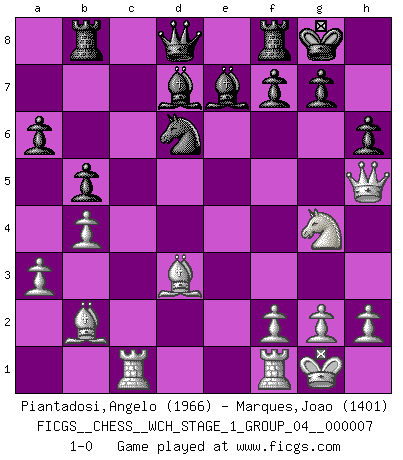 Last move : 1-0 2009 December 21 12:5:46 [Event "FICGS__CHESS__WCH_STAGE_1_GROUP_04__000007"] [Site "FICGS"] [Date "2009.11.17"] [Round "1"] [White "Piantadosi,Angelo"] [Black "Marques,Joao"] [Result "1-0"] [WhiteElo "1966"] [BlackElo "1401"] 1.Nf3 d5 2.c4 dxc4 3.Qa4+ Bd7 4.Qxc4 e6 5.Nc3 Nf6 6.e4 Nc6 7.d4 Be7 8.Bd3 O-O 9.a3 a6 10.O-O b5 11.Qa2 Na5 12.b4 Nb7 13.Bb2 Rc8 14.Rac1 c6 15.d5 cxd5 16.exd5 exd5 17.Nxd5 Nxd5 18.Qxd5 Rb8 19.Qh5 h6 20.Ne5 Nd6 21.Ng4 1-0 Reti accepted Kingside Castling by player Black (move 8) Kingside Castling by player White (move 10) Player White won this chess game. Follow this game move after move (download)We must make sure that Chess will not be like a dead language, very interesting, but for a very small group. (Sytze Faber) Ja, jede Frau in Holland liebt mich bestimmt, und alle Männer hassen mich. (Loek van Wely) Bobby es el jugador de Ajedrez mas fino que este país jamás haya producido. Su memoria para las movidas, su brillantez en soñar combinaciones y su feróz determinación por la victoria son algo extraño. (John Collins) Les erreurs sont comme les malheurs, elles n'arrivent jamais seules. (Siegbert Tarrasch) Treat your password like your toothbrush. Don't let anybody else use it, and get a new one every six months. (Clifford Stoll)
