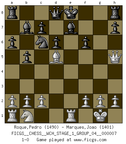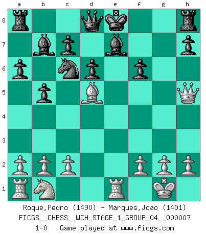 Last move : 1-0 2009 November 24 14:11:32 [Event "FICGS__CHESS__WCH_STAGE_1_GROUP_04__000007"] [Site "FICGS"] [Date "2009.11.02"] [Round "1"] [White "Roque,Pedro"] [Black "Marques,Joao"] [Result "1-0"] [WhiteElo "1490"] [BlackElo "1401"] 1.e4 e5 2.Nf3 Nc6 3.Bb5 a6 4.Ba4 b5 5.Bb3 Nf6 6.O-O Be7 7.d4 exd4 8.e5 Ng4 9.Re1 d6 10.Bd5 Bb7 11.Nxd4 Ngxe5 12.Nxc6 Nxc6 13.Bg5 f6 14.Bxf6 gxf6 15.Qh5+ 1-0 Ruy Lopez : Caro variation Kingside Castling by player White (move 6) Player White won this chess game. Follow this game move after move (download)Some sacrifices are sound; the rest are mine. (Mikhail Tal) Ein unbeabsichtigtes Patt ist der Gipfel der Dummheit. (Anonymous) El poder defensivo de una pieza clavada, solamente es imaginario. (Aaron Nimzovich) Nous vivons dans un monde échiquéen : chaque jour qui passe est un défi à relever. (Philosophe Sasha) Don't be discouraged. It's often the last key in the bunch that opens the lock. (Author unknown)