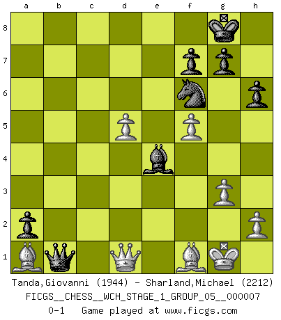 Last move : 0-1 2010 February 18 15:50:31 [Event "FICGS__CHESS__WCH_STAGE_1_GROUP_05__000007"] [Site "FICGS"] [Date "2009.11.02"] [Round "1"] [White "Tanda,Giovanni"] [Black "Sharland,Michael"] [Result "0-1"] [WhiteElo "1944"] [BlackElo "2212"] 1.d4 Nf6 2.Nf3 e6 3.e3 b6 4.c4 Bb7 5.Bd3 d5 6.O-O Bd6 7.Nc3 O-O 8.b3 Nbd7 9.Bb2 a6 10.Rc1 Qe7 11.Na4 dxc4 12.bxc4 c5 13.Ne5 Rfd8 14.f4 cxd4 15.exd4 b5 16.c5 bxa4 17.cxd6 Qxd6 18.Qxa4 Rac8 19.Qa5 h6 20.Rce1 Nb8 21.f5 Nc6 22.Nxc6 Qxc6 23.Rf2 e5 24.Rc2 Qd6 25.Rxc8 Rxc8 26.Qxe5 Qb4 27.Re2 Qa4 28.Qf4 Qxa2 29.Qd2 a5 30.Re1 Qb3 31.Re3 a4 32.Bb1 Qb6 33.Re1 Bd5 34.Bd3 Qd6 35.Ba1 a3 36.Bb1 Re8 37.Rxe8+ Nxe8 38.Bd3 Qc7 39.Qe3 Nf6 40.Qd2 Be4 41.Bf1 Qb8 42.Qa2 Ng4 43.g3 Qb4 44.Qe2 Nf6 45.Qd1 a2 46.d5 Qb1 0-1 Queen's pawn : Yusupov-Rubinstein system Kingside Castling by player White (move 6) Kingside Castling by player Black (move 7) Player Black won this chess game. Follow this game move after move (download)Chess is a foolish expedient for making idle people believe they are doing something very clever when they are only wasting their time. (George Bernard Shaw) Es gibt zwei Arten von Opfern: Korrekte und meine. (Mikhail Nekhemyevich Tal) El Ajedrez es como la guerra en un tablero. (Bobby Fischer) Avant la finale, les dieux ont créé le milieu de partie. (Tarrasch) Beep ! (R2D2 in Star Wars ep.3)
