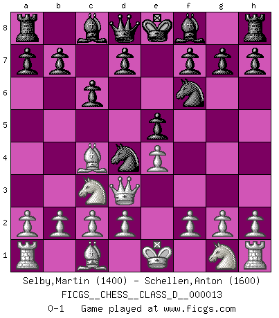 Last move : 0-1 2006 December 3 22:56:52 [Event "FICGS__CHESS__CLASS_D__000013"] [Site "FICGS"] [Date "2006.10.02"] [Round "1"] [White "Selby,Martin"] [Black "Schellen,Anton"] [Result "0-1"] [WhiteElo "1400"] [BlackElo "1600"] 1.e4 e5 2.Bc4 Nc6 3.Qf3 Nf6 4.Nc3 Nd4 5.Qd3 c6 0-1 Bishop's Opening Player Black won this chess game. Follow this game move after move (download)I'm not afraid of Spassky. The world knows I'm the best. You don't need a match to prove it. (Bobby Fischer) Wenn es im Universum noch irgendwo intelligente Lebewesen gibt, dann kennen sie Go. (Emanuel Lasker) Los problemas de Ajedrez exigen del compositor las mismas virtudes que caracterizan todo el arte de valor: originalidad, invención, concisión, armonía, complejidad e insinceridad explendida. (Vladimir Nabokov) On est toujours la mazette de quelqu'un d'autre. (Anonyme) Wipe them out. All of them. (Darth Sidious in Star Wars ep.1)