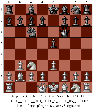 Last move : 1-0 2009 December 9 9:31:7 [Event "FICGS__CHESS__WCH_STAGE_1_GROUP_05__000007"] [Site "FICGS"] [Date "2009.11.02"] [Round "1"] [White "Migliorini,Roberto"] [Black "Raman,Ranganathan"] [Result "1-0"] [WhiteElo "1979"] [BlackElo "1401"] 1.b3 e5 2.Bb2 Qf6 3.e3 Nc6 4.Nc3 1-0 This chess game has been lost on time (started : 2009.11.02 22:18:55) Nimzovich-Larsen attack : Modern variation Player White won this chess game. Follow this game move after move (download)You know you're going to lose. Even when I was ahead I knew I was going to lose. - On playing against Fischer. (Andrew Soltis) Ich moechte nie einem Club beitreten, der Leute wie mich als Mitglieder aufnimmt. (Woody Allen) Cuando veas una buena jugada, trata de encontrar otra mejor. (Emanuel Lasker) Vous savez, camarade Pachman, je n'éprouve pas de plaisir à être ministre, je jouerais plutôt aux échecs comme vous, ou alors ferais une révolution au Venezuela. (Che Guevara à Ludek Pachman, 'Checkmate in Prague', 1975) The message for business people contemplating their place in the cyberspace is simple and direct: get linked or get lost. (Vic Sussman and Kenan Pollack)