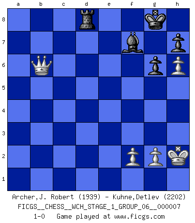 Last move : 1-0 2010 February 23 14:21:31 [Event "FICGS__CHESS__WCH_STAGE_1_GROUP_06__000007"] [Site "FICGS"] [Date "2009.11.02"] [Round "1"] [White "Archer,J. Robert"] [Black "Kuhne,Detlev"] [Result "1-0"] [WhiteElo "1939"] [BlackElo "2202"] 1.d4 d5 2.c4 dxc4 3.e4 e5 4.Nf3 exd4 5.Bxc4 Bb4+ 6.Nbd2 Nc6 7.O-O Nf6 8.e5 Nd5 9.Nb3 Nb6 10.Bb5 Qd5 11.Bxc6+ Qxc6 12.Nbxd4 Qd5 13.Qc2 c6 14.Rd1 O-O 15.Ng5 g6 16.Qe2 Rd8 17.Be3 Qxe5 18.Nxc6 Rxd1+ 19.Rxd1 bxc6 20.Rd8+ Bf8 21.Nxf7 Kxf7 22.Rxf8+ Kxf8 23.Bh6+ Qg7 24.Bxg7+ Kxg7 25.Qe7+ Kg8 26.Qe8+ Kg7 27.Qxc6 Kf7 28.a4 Be6 29.Qb7+ Kg8 30.h4 Bd5 31.Qe7 Nxa4 32.h5 Nb6 33.h6 Bf7 34.b4 Re8 35.Qxa7 Nd5 36.b5 Re1+ 37.Kh2 Nf6 38.Qd4 Ne8 39.Qb4 Rd1 40.b6 Nd6 41.b7 Nxb7 42.Qxb7 Rd8 43.Qb6 1-0 QGA : 3.e4 Kingside Castling by player White (move 7) Kingside Castling by player Black (move 14) 10 pieces endgame at move 42 : White KQPPP , Black KRBPP WHITE : King + 1 Queen 3 Pawns BLACK : King + 1 Rook 1 Bishop 2 Pawns Player White won this chess game. Follow this game move after move (download)Pawns: they are the soul of this game, they alone form the attack and defense. (Philidor) Stil? Ich habe keinen Stil! (Anatoly Karpov) El Ajedrez tiene tanto misterio como las mujeres. (Purdy) Seul un grand joueur sait à quel point il joue faiblement. (Xavier Tartacover) I'll be back. (Arnold Schwarzenegger)