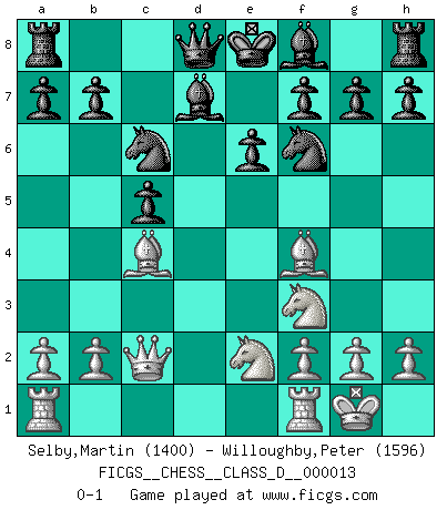 Last move : 0-1 2006 December 3 16:53:49 [Event "FICGS__CHESS__CLASS_D__000013"] [Site "FICGS"] [Date "2006.10.02"] [Round "1"] [White "Selby,Martin"] [Black "Willoughby,Peter"] [Result "0-1"] [WhiteElo "1400"] [BlackElo "1596"] 1.e4 e6 2.d4 d5 3.e5 c5 4.c4 dxc4 5.Bxc4 Qxd4 6.Nd2 Qxe5+ 7.Ne2 Nf6 8.O-O Nc6 9.Nf3 Qc7 10.Bf4 Qd8 11.Qc2 Bd7 0-1 Comment by player 1 : Martin Selby : Off we go again French : Advance variation Kingside Castling by player White (move 8) Player Black won this chess game. Follow this game move after move (download)Chess is no whit inferior to the violin, and we have a large number of professional violinists. (Mikhail Botvinnik) Gewöhnliche Menschen denken nur daran, wie sie ihre Zeit verbringen. Ein intelligenter Mensch versucht, sie auszunutzen. (Arthur Schopenhauer) ¿Se han dado cuenta de que Fischer casi nunca ha tenido piezas malas? El las intercambia y las piezas malas se quedan con sus oponenets. (Yuri Balashov) Celui qui prend des risques peut perdre, celui qui n'en prend pas perd toujours. (Xavier Tartacover) Experience is the name we all give to our mistakes. (Oscar Wilde)