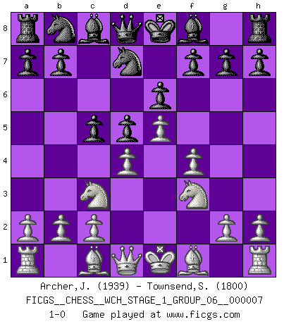 Last move : 1-0 2009 December 15 20:40:51 [Event "FICGS__CHESS__WCH_STAGE_1_GROUP_06__000007"] [Site "FICGS"] [Date "2009.11.02"] [Round "1"] [White "Archer,J. Robert"] [Black "Townsend,Steven"] [Result "1-0"] [WhiteElo "1939"] [BlackElo "1800"] 1.d4 e6 2.e4 d5 3.Nc3 Nf6 4.e5 Nfd7 5.f4 c5 6.Nf3 1-0 This chess game has been lost on time (started : 2009.11.02 22:21:16) Queen's pawn Player White won this chess game. Follow this game move after move (download)Openings teach you openings. Endgames teach you chess ! (Stephan Gerzadowicz) Der Knackpunkt bei der Konzentration ist, daß wir nur durch sie etwas Neues und Ungewöhnliches am Schachbrett finden können. Sie ist der einzige Weg durch neue neue Ideen eine Überraschung zu bereiten. (Garry Kasparov) Yo no creo en la psicología. Yo creo en las buenas movidas. (Bobby Fischer) Karpov est une pièce de musée. (Garry Kasparov) Logic : The art of thinking and reasoning in strict accordance with the limitations and incapacities of the human misunderstanding. (Ambrose Bierce)