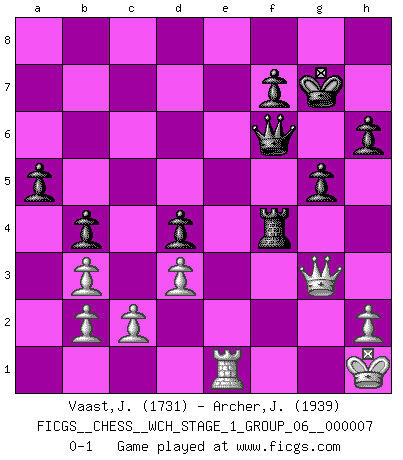 Last move : 0-1 2010 January 22 7:21:22 [Event "FICGS__CHESS__WCH_STAGE_1_GROUP_06__000007"] [Site "FICGS"] [Date "2009.11.02"] [Round "1"] [White "Vaast,Jean-Philippe"] [Black "Archer,J. Robert"] [Result "0-1"] [WhiteElo "1731"] [BlackElo "1939"] 1.e4 e5 2.Nc3 Nf6 3.Bc4 Nc6 4.d3 Na5 5.Nge2 c6 6.O-O Be7 7.Ng3 O-O 8.Bg5 h6 9.Bxf6 Bxf6 10.Nh5 Bg5 11.Bb3 b5 12.f4 exf4 13.Nxf4 b4 14.Nce2 d5 15.exd5 Nxb3 16.axb3 cxd5 17.Qe1 a5 18.Qf2 Ra6 19.Kh1 Re8 20.Ng3 Rc6 21.Ngh5 d4 22.Nh3 Bf6 23.Ng1 Re3 24.Nxf6+ Rxf6 25.Qh4 g5 26.Qh5 Bb7 27.Qg4 Kg7 28.Ne2 Bf3 29.Rxf3 R6xf3 30.gxf3 Rxe2 31.Rc1 Qd6 32.f4 Rf2 33.Qg3 Rxf4 34.Re1 Qf6 0-1 Vienna game Kingside Castling by player White (move 6) Kingside Castling by player Black (move 7) Player Black won this chess game. Follow this game move after move (download)The game of chess is the touchstone of the intellect. (Goethe) Obwohl ich alt bin, darf mir niemand den Finger in den Mund stecken, sonst beisse ich. (Wilhelm Steinitz) Nunca antes ha habido un jugador de Ajedrez con tal conocimiento a fondo de las complejidades del juego y una inmensa voluntad absolutamente indomable de ganar. Yo pienso que Fischer es el jugador mas grande que jamás haya existido. (Lisa Lane) Avec des compensations pour le matériel en plus... (Anonyme) What doesn't kill us makes us stronger. (Friedrich Nietzsche)
