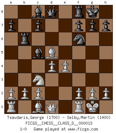 Last move : 1-0 2006 December 3 22:56:52 [Event "FICGS__CHESS__CLASS_D__000013"] [Site "FICGS"] [Date "2006.10.02"] [Round "1"] [White "Tsavdaris,George"] [Black "Selby,Martin"] [Result "1-0"] [WhiteElo "1700"] [BlackElo "1400"] 1.e4 e5 2.Nf3 Nc6 3.Bb5 Nf6 4.Nc3 Bc5 5.O-O d5 6.Nxe5 O-O 7.Nxc6 bxc6 8.Bxc6 Rb8 9.d4 Rb6 10.Bxd5 1-0 Ruy Lopez : Berlin defense Kingside Castling by player White (move 5) Kingside Castling by player Black (move 6) Player White won this chess game. Follow this game move after move (download)At this time Fischer is simply a level above all the best Chessplayers in the world. (John Jacobs) Vom Schach wurde gesagt das Leben sei dafür nicht lange genug. Aber das ist der Fehler des Lebens, nicht des Schach'. (Irving Chernev) Durante una competencia de Ajedrez, un Maestro de Ajedrez deberá ser una combinación de presa de caza y un Monge. (Alexander Alekhine) Des idées, des idées, j'en ai cent, j'en ai mille. Des bonnes, des mauvaises, applicables, irréalisables... Il suffit de faire le tri ! (Roos) Experiences are the keys to life. (Daniel Parmet)