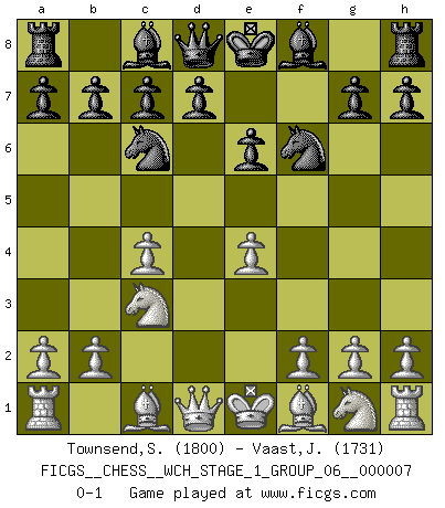 Last move : 0-1 2009 December 10 8:15:30 [Event "FICGS__CHESS__WCH_STAGE_1_GROUP_06__000007"] [Site "FICGS"] [Date "2009.11.02"] [Round "1"] [White "Townsend,Steven"] [Black "Vaast,Jean-Philippe"] [Result "0-1"] [WhiteElo "1800"] [BlackElo "1731"] 1.c4 f5 2.Nc3 e6 3.d3 Nf6 4.e4 fxe4 5.dxe4 Nc6 0-1 This chess game has been lost on time (started : 2009.11.02 22:21:16) English : Anglo-Dutch defense Player Black won this chess game. Follow this game move after move (download)Chess is no whit inferior to the violin, and we have a large number of professional violinists. (Mikhail Botvinnik) Wenn sie aufgeben, dann danke ich Ihnen für das Spiel (Eventualzug beim Fernschach). (Anonymous) ¿Porque tengo que perder ante este idiota?. (Aron Nimzovich) On peut tirer plus d'utilité d'une partie perdue que de 100 parties gagnées. (Capablanca) I have opinions of my own - strong opinions - but I don't always agree with them. (George Bush)