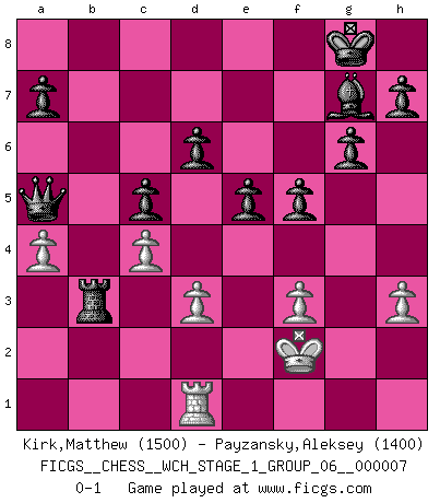 Last move : 0-1 2009 December 11 18:19:0 [Event "FICGS__CHESS__WCH_STAGE_1_GROUP_06__000007"] [Site "FICGS"] [Date "2009.11.02"] [Round "1"] [White "Kirk,Matthew"] [Black "Payzansky,Aleksey"] [Result "0-1"] [WhiteElo "1500"] [BlackElo "1400"] 1.e4 c5 2.Nc3 Nc6 3.f4 g6 4.Nf3 Bg7 5.b3 Nf6 6.Bb2 Nxe4 7.Bc4 O-O 8.O-O d6 9.Bd3 Nf6 10.Re1 Bg4 11.h3 Bd7 12.Qe2 Nh5 13.Bb5 Nxf4 14.Qe3 e5 15.Rad1 Nd4 16.Qe4 Nxb5 17.Qxb7 Rb8 18.Qe4 Bf5 19.Nxb5 Bxe4 20.Rxe4 Rxb5 21.c4 Ra5 22.a4 f5 23.R4e1 Nd3 24.Bc3 Nxe1 25.Bxa5 Nxf3+ 26.Kf2 Qxa5 27.gxf3 Rb8 28.d3 Rxb3 0-1 Sicilian : Grand Prix attack Kingside Castling by player Black (move 7) Kingside Castling by player White (move 8) Player Black won this chess game. Follow this game move after move (download)If cunning alone were needed to excel, women would be the best Chess players. (Albin) Ich hatte Angst gegen einen russischen Großmeister zu verlieren, und er befürchtete gegen einen kleinen Jungen zu verlieren. (über ein Remis gegen Juri Awerbach). (Robert James Fischer) El Ajedrez es realmente noventa y nueve por ciento calculación. (Soltis) La vie et les Echecs sont tous les deux une lutte constante. (Lasker) A journey of a thousand sites begins with a single click. (Author unknown)