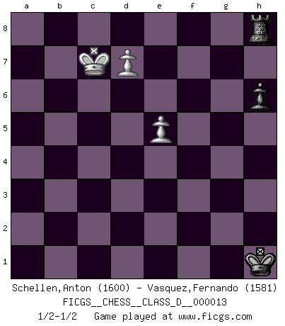 Last move : 1/2-1/2 2007 August 11 10:16:45 [Event "FICGS__CHESS__CLASS_D__000013"] [Site "FICGS"] [Date "2006.10.02"] [Round "1"] [White "Schellen,Anton"] [Black "Vasquez,Fernando"] [Result "1/2-1/2"] [WhiteElo "1600"] [BlackElo "1581"] 1.b4 e5 2.Bb2 Bxb4 3.Bxe5 Nf6 4.e3 Nc6 5.Bb2 O-O 6.Nf3 d5 7.Be2 Re8 8.O-O Bg4 9.d3 Qe7 10.Nbd2 Rad8 11.Rb1 Bf5 12.c4 dxc4 13.Nxc4 Nd5 14.a3 Bc3 15.Qb3 Bxb2 16.Rxb2 Nb6 17.Nxb6 axb6 18.d4 Be4 19.Qc3 Bd5 20.Rb5 Na7 21.Rb4 Qe6 22.Qxc7 b5 23.Qf4 Qc8 24.R4b1 Re4 25.Qg3 Rg4 26.Qh3 Rg6 27.Qxc8 Rxc8 28.Rfc1 Rgc6 29.Re1 Rc3 30.Ra1 Kf8 31.Ne5 R8c7 32.Bf1 Be4 33.Red1 Bc2 34.Rd2 Ke7 35.Nd3 Kd6 36.g3 h6 37.h4 b6 38.Be2 Nc6 39.Ne1 Be4 40.Bxb5 Na5 41.Rb2 Rc1 42.Rxc1 Rxc1 43.Kf1 Ra1 44.a4 Bd5 45.Ke2 Nc4 46.Bxc4 Bxc4+ 47.Kd2 Kc6 48.Rb4 Ra2+ 49.Nc2 Bd5 50.Kc1 f5 51.Rb1 Rxa4 52.Nb4+ Kd6 53.Nxd5 Kxd5 54.Rxb6 Ke4 55.Rb5 g6 56.Kd2 Ra2+ 57.Kc3 Rxf2 58.Re5+ Kf3 59.d5 Ra2 60.d6 Ra8 61.Kc4 Kxg3 62.Kd5 Rd8 63.h5 gxh5 64.Rxf5 h4 65.Kc6 h3 66.Kc7 h2 67.Rh5 Rh8 68.d7 Kg2 69.e4 h1Q 70.Rxh1 Kxh1 71.e5 1/2-1/2 Polish (Sokolsky) opening Kingside Castling by player Black (move 5) Kingside Castling by player White (move 8) 10 pieces endgame at move 61 : White KRPPP , Black KRPPP WHITE : King + 1 Rook 3 Pawns BLACK : King + 1 Rook 3 Pawns 9 pieces endgame at move 63 : White KRPP , Black KRPPP WHITE : King + 1 Rook 2 Pawns BLACK : King + 1 Rook 3 Pawns 8 pieces endgame at move 64 : White KRPP , Black KRPP WHITE : King + 1 Rook 2 Pawns BLACK : King + 1 Rook 2 Pawns Promotion Queen by player Black (move 69) 7 pieces endgame at move 70 : White KRPP , Black KRP WHITE : King + 1 Rook 2 Pawns BLACK : King + 1 Rook 1 Pawn 6 pieces endgame at move 70 : White KPP , Black KRP WHITE : King + 2 Pawns BLACK : King + 1 Rook 1 Pawn This chess game ended in a draw. Follow this game move after move (download)It is not enough to be a good player... you must also play well. (Siegbert Tarrasch) Es macht mich traurig, wenn ich sehe, dass Golfprofis mehr verdienen als Schachsportler. Obwohl ich davon überzeugt bin, dass wir Schachspieler viel härter trainieren müssen als die Golfer. (Alexandra Kosteniuk) El sobresalir en el Ajedrez es un signo de una mente intrigante. (Sir Arthur Conan Doyle) D'abord les bases : Jouez et étudiez, puis étudiez et jouez, ensuite jouez et étudiez, puis étudiez et jouez. Deuxièmement : Donnez toujours le meilleur de vous-même ! (Ken Smith) Don't be irreplaceable, if you can't be replaced, you can't be promoted. (Dan Rotaru)