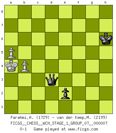 Last move : 0-1 2010 April 4 8:32:46 [Event "FICGS__CHESS__WCH_STAGE_1_GROUP_07__000007"] [Site "FICGS"] [Date "2009.11.02"] [Round "1"] [White "Farahmi,Andi"] [Black "van der Kemp,Michel"] [Result "0-1"] [WhiteElo "1729"] [BlackElo "2199"] 1.d4 d5 2.c4 c6 3.Nc3 Nf6 4.Nf3 e6 5.e3 Nbd7 6.Bd3 dxc4 7.Bxc4 b5 8.Bd3 Bb7 9.e4 b4 10.Na4 c5 11.e5 Nd5 12.Nxc5 Nxc5 13.dxc5 Bxc5 14.O-O h6 15.Nd2 Qc7 16.Ne4 Be7 17.Bb5+ Kf8 18.Qd4 a6 19.Be2 Rd8 20.Qa7 Kg8 21.Rd1 Kh7 22.Be3 Nxe3 23.fxe3 Rxd1+ 24.Rxd1 Ra8 25.Qd4 Bd5 26.Nd6 f6 27.Qd3+ g6 28.h4 Rg8 29.h5 f5 30.hxg6+ Rxg6 31.Nxf5 Rxg2+ 32.Kf1 Kh8 33.Nxe7 Qxe7 34.Qd4 Qg7 35.Ke1 Qg3+ 36.Kd2 Qf2 37.Re1 h5 38.Qd3 Kg7 39.Qxa6 h4 40.Qa7+ Qf7 41.Qd4 h3 42.Qh4 Bf3 43.Qxh3 Qd7+ 44.Kc1 Be4 45.Qxg2+ Bxg2 46.Rg1 Kh6 47.Rxg2 Qc6+ 48.Kd2 Qxg2 49.Kd3 Qd5+ 50.Kc2 Qxe5 51.a3 b3+ 52.Kxb3 Qxe3+ 53.Ka2 Qxe2 54.a4 e5 55.Ka3 e4 56.a5 Qd3+ 57.Ka4 e3 58.b4 e2 0-1 This chess game has been lost on time (started : 2009.11.02 22:22:56) QGD Slav defense Kingside Castling by player White (move 14) 10 pieces endgame at move 48 : White KBPPPP , Black KQPP WHITE : King + 1 Bishop 4 Pawns BLACK : King + 1 Queen 2 Pawns 9 pieces endgame at move 50 : White KBPPP , Black KQPP WHITE : King + 1 Bishop 3 Pawns BLACK : King + 1 Queen 2 Pawns 8 pieces endgame at move 52 : White KBPPP , Black KQP WHITE : King + 1 Bishop 3 Pawns BLACK : King + 1 Queen 1 Pawn 7 pieces endgame at move 52 : White KBPP , Black KQP WHITE : King + 1 Bishop 2 Pawns BLACK : King + 1 Queen 1 Pawn 6 pieces endgame at move 53 : White KPP , Black KQP WHITE : King + 2 Pawns BLACK : King + 1 Queen 1 Pawn Player Black won this chess game. Follow this game move after move (download)I still hope to kill Fischer. (Boris Spassky) Irgendwie scheint mir sonntags früh um 9 Uhr der Killerinstinkt verloren gegangen zu sein. (Alexej Shirov) Un Peón pasado aumenta su poder a medida de que el número de piezas en el tablero disminuye. (Capablanca) Dans le domaine de la peinture, de la gravure et de la sculpture, dès la première décennie de notre siècle, les artistes abandonnent la représentation de la partie d'échecs pour se concentrer sur les pièces, sur les échiquiers et sur toutes les variations auxquelles les unes et les autres peuvent donner lieu. On passe en quelque sorte d'un thème social à un thème musical (au sens de la musica médiévale, c'est-à-dire d'une notion qui inclue le rythme, l'harmonie, la construction et la déconstruction, etc.). Graphiquement et picturalement, l'échiquier apparaît comme une structure ouverte, dynamique, d'une richesse infinie, autorisant toutes les combinatoires et débouchant sur des mouvements et des rythmes de nature exponentielle. (Michel Pastoureau) When you stop learning you start dying. (M. Scott Adams)