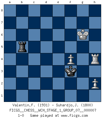 Last move : 1-0 2010 March 12 2:5:19 [Event "FICGS__CHESS__WCH_STAGE_1_GROUP_07__000007"] [Site "FICGS"] [Date "2009.11.02"] [Round "1"] [White "Valentin,Florea"] [Black "Suhardjo,Johanes"] [Result "1-0"] [WhiteElo "1931"] [BlackElo "1800"] 1.e4 e5 2.Nf3 Nc6 3.Bb5 a6 4.Ba4 Nf6 5.O-O b5 6.Bb3 Bb7 7.d3 Be7 8.Nc3 O-O 9.Be3 d6 10.a3 Na5 11.Ba2 c5 12.b4 Nc6 13.Nd5 Nd4 14.Nxe7+ Qxe7 15.c3 Nxf3+ 16.Qxf3 c4 17.Bg5 h6 18.Bxf6 Qxf6 19.Qxf6 gxf6 20.f3 cxd3 21.Rfd1 f5 22.exf5 e4 23.fxe4 Bxe4 24.Bb1 Bxf5 25.Bxd3 Bxd3 26.Rxd3 Rfc8 27.a4 bxa4 28.Rxa4 Rc4 29.Ra3 Rac8 30.Rxd6 Rxc3 31.Rxc3 Rxc3 32.Rxa6 Rb3 33.Rb6 Kg7 34.b5 f6 35.Rb8 Kg6 36.b6 Kf5 37.b7 Kf4 38.Kf2 Rb2+ 39.Ke1 h5 40.Kd1 f5 41.Kc1 Rb6 42.Kc2 Rb5 43.Kd3 Rb6 44.Kd4 Rb5 45.Kc4 Rb6 46.Kd5 Rb2 47.Kd6 Rb1 48.Kc6 Rc1+ 49.Kd7 Rb1 50.g3+ Kf3 51.Ke6 Rb5 52.Kd6 Rb2 53.Ke5 Rb5+ 54.Ke6 Kg2 55.Rh8 Rxb7 56.Rxh5 f4 57.gxf4 Kf3 58.Rh4 Rb6+ 59.Kf5 Rb5+ 60.Kg6 1-0 Ruy Lopez : Archangelsk (counterthrust) variation Kingside Castling by player White (move 5) Kingside Castling by player Black (move 8) 10 pieces endgame at move 31 : White KRPPP , Black KRPPP WHITE : King + 1 Rook 3 Pawns BLACK : King + 1 Rook 3 Pawns 9 pieces endgame at move 32 : White KRPPP , Black KRPP WHITE : King + 1 Rook 3 Pawns BLACK : King + 1 Rook 2 Pawns 8 pieces endgame at move 55 : White KRPP , Black KRPP WHITE : King + 1 Rook 2 Pawns BLACK : King + 1 Rook 2 Pawns 7 pieces endgame at move 56 : White KRPP , Black KRP WHITE : King + 1 Rook 2 Pawns BLACK : King + 1 Rook 1 Pawn 6 pieces endgame at move 57 : White KRPP , Black KR WHITE : King + 1 Rook 2 Pawns BLACK : King + 1 Rook Player White won this chess game. Follow this game move after move (download)Excellence at Chess is one mark of a scheming mind. (Sir Arthur Conan Doyle) Im Internet Chess Club betrug mein Rating vorübergehend 3350 ELO-Punkte. (Sergej Karjakin) El Peón aislado arroja penumbra sobre todo el tablero. (Aaron Nimzovich) Avec des compensations pour le matériel en plus... (Anonyme) We need strong personalities and only one world champion to attract sponsors. (Anatoly Karpov)