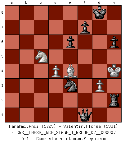 Last move : 0-1 2010 March 8 21:39:28 [Event "FICGS__CHESS__WCH_STAGE_1_GROUP_07__000007"] [Site "FICGS"] [Date "2009.11.02"] [Round "1"] [White "Farahmi,Andi"] [Black "Valentin,Florea"] [Result "0-1"] [WhiteElo "1729"] [BlackElo "1931"] 1.d4 Nf6 2.c4 e6 3.Nf3 b6 4.g3 Ba6 5.b3 Bb4+ 6.Bd2 Be7 7.Nc3 O-O 8.Bg2 c6 9.O-O d5 10.Ne5 Nfd7 11.Nxd7 Qxd7 12.cxd5 cxd5 13.Re1 Nc6 14.Be3 Rac8 15.Rc1 Ba3 16.Rb1 Bb4 17.Rc1 h6 18.Rc2 Ne7 19.Qd2 Nf5 20.Bf4 g5 21.Be3 Rc6 22.Rec1 Rfc8 23.h4 Qc7 24.Nxd5 Rxc2 25.Nxc7 Rxd2 26.Bxd2 Bxd2 27.Rc2 Bb4 28.Nxa6 Rxc2 29.Nxb4 Rc1+ 30.Kh2 gxh4 31.e3 hxg3+ 32.fxg3 a5 33.Nd3 Rc2 34.Kh3 Nxe3 35.Be4 Rxa2 36.Bc6 Ra3 37.Ba4 b5 38.Bxb5 Rxb3 39.Ba6 Rb1 40.Kh2 a4 41.Nc5 a3 42.Bd3 Rb2+ 43.Kh3 a2 44.Na4 Rd2 45.Be4 a1Q 46.Nc5 Qf1+ 47.Kh4 Rh2+ 0-1 This chess game has been lost on time (started : 2009.11.02 22:22:56) Queen's Indian : Nimzovich variation (exaggerated Fianchetto) Kingside Castling by player Black (move 7) Kingside Castling by player White (move 9) Promotion Queen by player Black (move 45) Player Black won this chess game. Follow this game move after move (download)Let the perfectionist play postal. (Yasser Seirawan) Um sich vor der Gefahr einer Erkältung zu schützen, sorge der wanderlustige König beizeiten für ein brauchbares Versteck. (Aaron Nimzowitsch) Peones: ellos son el alma de esta partida, solos forman el ataque y la defensa. (Philidor) Roi des jeux et jeu des rois, les échecs portent en eux un sentiment d'infini. Ils donnent à celui qui s'est efforcé d'en approfondir les arcanes l'impression de n'être pas à la mesure de l'homme; en fait, ils constituent un résumé de l'univers, un microcosme, et figurent cette grande échelle qui, dans les plans de la lumière descend jusqu'à la matière, qui des abîmes insondables remonte jusqu'en l'infini de Dieu. (Pyrame) It is a good thing for an uneducated man to read books of quotations. (Winston Churchill)