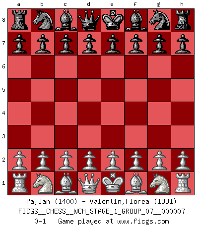 Last move : 0-1 2009 December 3 8:52:18 [Event "FICGS__CHESS__WCH_STAGE_1_GROUP_07__000007"] [Site "FICGS"] [Date "2009.11.02"] [Round "1"] [White "Pa,Jan"] [Black "Valentin,Florea"] [Result "0-1"] [WhiteElo "1400"] [BlackElo "1931"] 0-1 This chess game has been lost on time (started : 2009.11.02 22:22:56) Player Black won this chess game. Follow this game move after move (download)A strong memory, concentration, imagination, and a strong will is required to become a great Chess player. (Bobby Fischer) Sie bekommen vielleicht den Eindruck, dass die Spitzenspieler überhaupt gar nicht so stark sind. Aber das stimmt nicht. Es ist eine Illusion. Mit einem Computer an der Seite ist es sehr leicht, Urteile zu fällen, aber wenn man alleine am Brett sitzt, sieht die Sache ganz anders aus. (Vladimir Kramnik) El Ajedrez es el gimnasio de la mente. (Blaise Pascal) On peut tirer plus d'utilité d'une partie perdue que de 100 parties gagnées. (Capablanca) Hardware: the parts of a computer that can be kicked. (Jeff Persis)