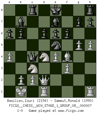 Last move : 1-0 2010 February 12 8:33:59 [Event "FICGS__CHESS__WCH_STAGE_1_GROUP_08__000007"] [Site "FICGS"] [Date "2009.11.02"] [Round "1"] [White "Basiliev,Iouri"] [Black "Sammut,Ronald"] [Result "1-0"] [WhiteElo "2194"] [BlackElo "1990"] 1.e4 c5 2.Nf3 d6 3.d4 cxd4 4.Nxd4 Nf6 5.Nc3 a6 6.Be3 e6 7.Be2 Qc7 8.a4 b6 9.Qd2 Nbd7 10.O-O-O Be7 11.g4 Bb7 12.f3 Ne5 13.h4 Nc4 14.Bxc4 Qxc4 15.Kb1 Nd7 16.h5 Ne5 17.Bg5 f6 18.Bf4 Rc8 19.g5 1-0 This chess game has been lost on time (started : 2009.11.02 22:25:32) Sicilian : Najdorf, Byrne (English) attack Queenside Castling by player White (move 10) Player White won this chess game. Follow this game move after move (download)Do you realize Fischer almost never has any bad pieces? He exchanges them, and the bad pieces remain with his opponents. (Yuri Balashov) Ich erzeugte keinen Neid, da mich die Schachspieler als Musiker und die Musiker als Schachspieler betrachteten. (Mark Taimanov) Yo siempre he tenido un ligero sentimiento de lástima por una persona que no tiene conocimiento del Ajedrez. (Siegbert Tarrasch) Les Echecs ont trois composantes : le temps, l'espace et le matériel en dernier. (Mikhail Tal) Always two there are. No more no less. A master, and an apprentice. (Master Yoda in Star Wars ep.1)