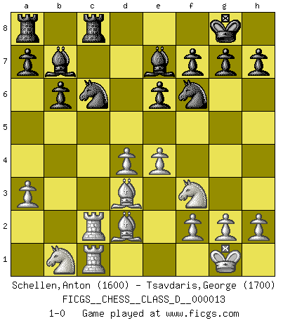 Last move : 1-0 2007 January 20 6:47:37 [Event "FICGS__CHESS__CLASS_D__000013"] [Site "FICGS"] [Date "2006.10.02"] [Round "1"] [White "Schellen,Anton"] [Black "Tsavdaris,George"] [Result "1-0"] [WhiteElo "1600"] [BlackElo "1700"] 1.b4 Nf6 2.Bb2 e6 3.a3 d5 4.e3 c5 5.bxc5 Bxc5 6.Nf3 Nc6 7.d4 Qb6 8.Qc1 Be7 9.Bd3 O-O 10.O-O Qc7 11.c4 Na5 12.cxd5 Qxc1 13.Bxc1 Nxd5 14.Ra2 b6 15.Rb2 Bb7 16.Bd2 Nc6 17.Rc1 Rfc8 18.e4 Nf6 19.Rbc2 1-0 This chess game has been lost on time (started : 2006.10.02 1:22:44) Polish (Sokolsky) opening Kingside Castling by player Black (move 9) Kingside Castling by player White (move 10) Player White won this chess game. Follow this game move after move (download)The Chess pieces are the block alphabet which shapes thoughts; and these thoughts, although making a visual design on the chessboard, express their beauty abstractly, like a poem. (Marcel Duchamp) Ich bin es gewohnt, das die Jugend mir überhaupt keinen Respekt entgegenbringt. (Alexander Morozewich) El tablero es el mundo, las piezas es el fenomeno del universo, las reglas del juego son lo que llamamos leyes de la naturaleza y el jugador del lado opuesto, se encuentra oculto a nuestra vista. (Thomas Huxley) Les échecs, c'est la lutte contre l'erreur. (Johannes Zukertort) A shortcut is the longest distance between two points. (Don Groves)