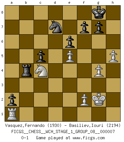 Last move : 0-1 2010 April 9 8:45:55 [Event "FICGS__CHESS__WCH_STAGE_1_GROUP_08__000007"] [Site "FICGS"] [Date "2009.11.02"] [Round "1"] [White "Vasquez,Fernando"] [Black "Basiliev,Iouri"] [Result "0-1"] [WhiteElo "1930"] [BlackElo "2194"] 1.e4 c5 2.d4 cxd4 3.c3 dxc3 4.Nxc3 Nc6 5.Nf3 e6 6.Bc4 a6 7.O-O b5 8.Bd3 Bb7 9.Bf4 h6 10.h3 Rc8 11.e5 Nge7 12.Be4 Ng6 13.Bg3 Be7 14.Qd2 Na5 15.Bxb7 Nxb7 16.Ne4 Nc5 17.Nxc5 Rxc5 18.Rfd1 Qc7 19.Rac1 O-O 20.Rxc5 Qxc5 21.Rc1 Qa7 22.h4 h5 23.a3 Ra8 24.Qc3 b4 25.axb4 Qb7 26.Qd2 Bxb4 27.Qg5 Be7 28.Qxh5 Qxb2 29.Rd1 a5 30.Qg4 a4 31.h5 Nf8 32.Qe4 Qb3 33.Ra1 Ra5 34.Nd2 Qb2 35.Qe1 Bb4 36.Nc4 Qd4 37.Qf1 Rc5 38.Ne3 a3 39.Qd1 Qxd1+ 40.Nxd1 a2 41.Bf4 Rc2 42.g4 Bc5 43.Be3 d6 44.Kg2 Nd7 45.Bxc5 dxc5 46.Ne3 Rb2 47.Nc4 Rb4 0-1 This chess game has been lost on time (started : 2009.11.02 22:25:32) Sicilian : Smith-Morra gambit Kingside Castling by player White (move 7) Kingside Castling by player Black (move 19) Player Black won this chess game. Follow this game move after move (download)Chess is a sea in which a gnat may drink and an elephant may bathe. (Hindu proverb) Das Spiel gibt uns die Genugtuung, die das Leben uns versagt. (Emanuel Lasker) Las ideas audaces son como las piezas del Ajedrez que avanzan hacia adelante. Ellas pueden ser vencidas, pero también pueden iniciar una partida victoriosa. (Goethe) Un footballeur joue avec ses pieds, parfois avec sa tête. Un joueur d'échecs ne joue qu'avec sa tête. Et quand il ne joue plus, il meurt. (Jacob Murray) Do you know these so called Volunteers don't even get paid! (Simpsons)