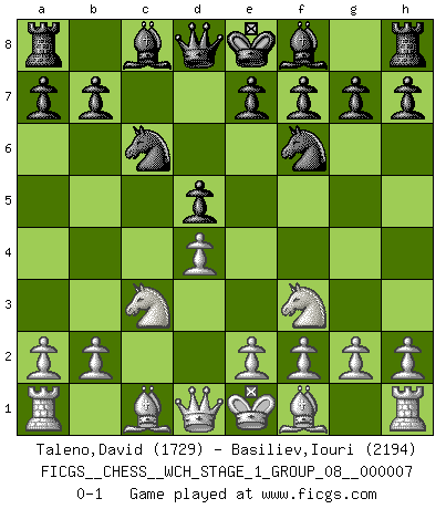 Last move : 0-1 2010 January 18 20:19:36 [Event "FICGS__CHESS__WCH_STAGE_1_GROUP_08__000007"] [Site "FICGS"] [Date "2009.11.02"] [Round "1"] [White "Taleno,David"] [Black "Basiliev,Iouri"] [Result "0-1"] [WhiteElo "1729"] [BlackElo "2194"] 1.d4 d5 2.c4 c6 3.cxd5 cxd5 4.Nc3 Nf6 5.Nf3 Nc6 0-1 This chess game has been lost on time (started : 2009.11.02 22:25:32) QGD Slav defense : Exchange variation Player Black won this chess game. Follow this game move after move (download)Fischer is the strongest player in the world. In fact, the strongest player who ever lived. (Larry Evans) Gegen einen Schachcomputer zu verlieren ist wie Löcher in den Strümpfen zuhaben. Es ist nicht peinlich, solange man der einzige ist der es weiß. (Anonymous) El Ajedrez es tan interesante por sí solo, que no es necesario un interés monetario para persuadir a una persona a que lo practique; por lo tanto, nunca se juega por dinero. (Benjamin Franklin) Je fais ceci parce que dans cinquante coups j'obtiendrai cela; je m'appelle Mikhail Moisevitch Botvinnik. (Botvinnik) I live to kill Traxler counterattack. (Ilmars Cirulis)