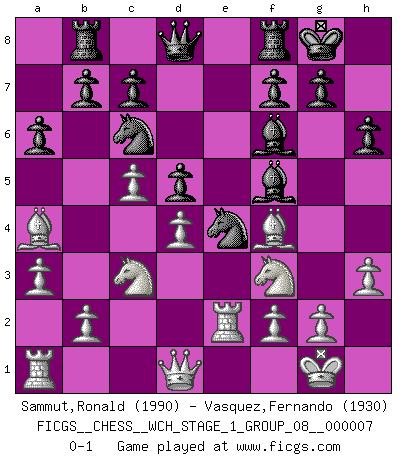 Last move : 0-1 2010 January 30 20:40:8 [Event "FICGS__CHESS__WCH_STAGE_1_GROUP_08__000007"] [Site "FICGS"] [Date "2009.11.02"] [Round "1"] [White "Sammut,Ronald"] [Black "Vasquez,Fernando"] [Result "0-1"] [WhiteElo "1990"] [BlackElo "1930"] 1.e4 e5 2.Nf3 Nf6 3.Nxe5 d6 4.Nf3 Nxe4 5.d4 d5 6.Bd3 Be7 7.O-O O-O 8.c4 Nf6 9.Nc3 Nc6 10.h3 Nb4 11.Be2 h6 12.a3 Nc6 13.Bf4 Be6 14.c5 Ne4 15.Re1 Bf6 16.Bb5 Bf5 17.Re2 a6 18.Ba4 Rb8 0-1 This chess game has been lost on time (started : 2009.11.02 22:25:32) Petrov : Classical attack, Mason variation Kingside Castling by player White (move 7) Kingside Castling by player Black (move 7) Player Black won this chess game. Follow this game move after move (download)You sit at the board and suddenly your heart leaps. Your hand trembles to pick up the piece and move it. But what Chess teaches you is that you must sit there calmly and think about whether it's really a good idea and whether there are other better ideas. (Stanley Kubrick) Schach ist Krieg, im Schach geht es um testosterongesteuerte Urschreie. (Garry Kasparov) En el Ajedrez, cuando menos, el valiente hereda la tierra. (Edmar Mednis) Je ne suis pas le dernier à jouer lâchement des coups douteux pendant le zeïtnot de l'adversaire pour l'achever: en effet les coups qui font le plus peur sont ceux que l'on ne comprend pas. Je me fais souvent peur quand je joue. (Un professeur anonyme) It is not enough to be a good player... you must also play well. (Siegbert Tarrasch)