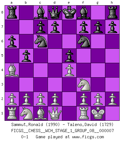 Last move : 0-1 2010 February 3 8:14:27 [Event "FICGS__CHESS__WCH_STAGE_1_GROUP_08__000007"] [Site "FICGS"] [Date "2009.11.02"] [Round "1"] [White "Sammut,Ronald"] [Black "Taleno,David"] [Result "0-1"] [WhiteElo "1990"] [BlackElo "1729"] 1.e4 e5 2.Nf3 Nc6 3.Bb5 a6 4.Ba4 Nf6 5.O-O b5 0-1 This chess game has been lost on time (started : 2009.11.02 22:25:32) Ruy Lopez : 5.O-O Kingside Castling by player White (move 5) Player Black won this chess game. Follow this game move after move (download)The isolated Pawn casts gloom over the entire chessboard. (Aaron Nimzovich) Es gibt nur zwei wahre Schachgenies - das andere war Wilhelm Steinitz, der Weltmeister von 1872 bis 1894. (Robert James Fischer) El Ajedrez es el gimnasio de la mente. (Blaise Pascal) Horreur, mais aussi harmonie suprême : qu'y avait-il en effet au monde en dehors des échecs ? Le brouillard, l'inconnu, le non-être... (Vladimir Nabokov) The large trees attract high winds. (Chinese proverb)
