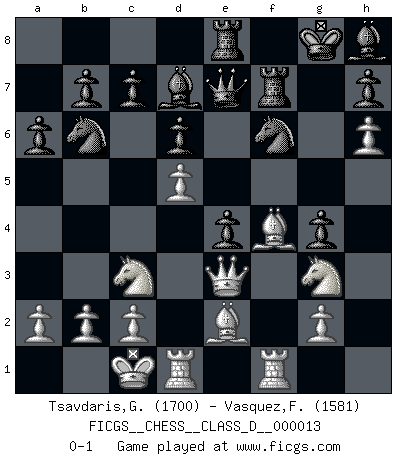 Last move : 0-1 2007 January 29 19:49:17 [Event "FICGS__CHESS__CLASS_D__000013"] [Site "FICGS"] [Date "2006.10.02"] [Round "1"] [White "Tsavdaris,George"] [Black "Vasquez,Fernando"] [Result "0-1"] [WhiteElo "1700"] [BlackElo "1581"] 1.e4 e5 2.f4 exf4 3.Nf3 d6 4.d4 g5 5.h4 g4 6.Ng1 f5 7.Nc3 fxe4 8.Bxf4 Nf6 9.d5 Bg7 10.h5 O-O 11.Nge2 Nbd7 12.Qd2 Qe7 13.h6 Bh8 14.O-O-O Nb6 15.Ng3 Bd7 16.Be2 Rae8 17.Rhf1 a6 18.Qe3 Rf7 0-1 This chess game has been lost on time (started : 2006.10.02 1:22:44) KGA : Fischer defense Kingside Castling by player Black (move 10) Queenside Castling by player White (move 14) Player Black won this chess game. Follow this game move after move (download)It is difficult to play against Einstein's theory --on his first loss to Fischer. (Mikhail Tal) Die FIDE ist dabei in die Hände der russischen Mafia zu fallen. (Larry Evans) Los asuntos humanos son como una partida de Ajedrez: solo aquellos que no lo toman seriamente, pueden ser llamados buenos jugadores. (Hung Tzu Ch'eng) Le génie consiste à savoir transgresser les règles au moment opportun. (Teichmann) It's not enough to succeed. Others must fail. (Gore Vidal)