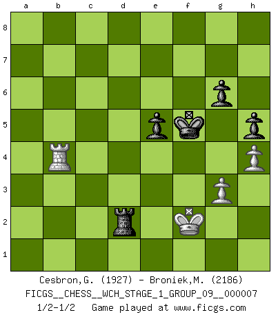 Last move : 1/2-1/2 2010 June 10 13:4:30 [Event "FICGS__CHESS__WCH_STAGE_1_GROUP_09__000007"] [Site "FICGS"] [Date "2009.11.02"] [Round "1"] [White "Cesbron,Guy"] [Black "Broniek,Mariusz Maciej"] [Result "1/2-1/2"] [WhiteElo "1927"] [BlackElo "2186"] 1.e4 c5 2.Nf3 d6 3.d4 cxd4 4.Nxd4 Nf6 5.Nc3 a6 6.Bc4 e6 7.Bb3 b5 8.O-O Be7 9.Qf3 Qb6 10.Be3 Qb7 11.Qg3 b4 12.Na4 Nbd7 13.f3 O-O 14.Rfd1 Ne5 15.a3 bxa3 16.Rxa3 Bd7 17.Nb6 Nh5 18.Qh3 Qxb6 19.Qxh5 Qb7 20.Bg5 Bxg5 21.Qxg5 a5 22.f4 h6 23.Qg3 Nc6 24.Qf2 Nxd4 25.Qxd4 Bc6 26.Bc4 Bxe4 27.Rg3 g6 28.Rb3 Qa7 29.Qxa7 Rxa7 30.Rxd6 Bxc2 31.Rc3 Be4 32.Rd4 Ba8 33.Ra3 Rb8 34.b3 Bc6 35.g3 Bb5 36.Kf2 Bxc4 37.Rxc4 Rd7 38.Ke3 Rd5 39.Rca4 Kg7 40.h4 R8b5 41.b4 axb4 42.Rb3 Kf6 43.Raxb4 Rxb4 44.Rxb4 Kf5 45.Rb7 f6 46.Rb6 h5 47.Ra6 Rc5 48.Rb6 Rc3+ 49.Kf2 e5 50.fxe5 fxe5 51.Rb4 Rc2+ 52.Kf3 Rc1 53.Kf2 Rc6 54.Kf3 Ra6 55.Rc4 Ra3+ 56.Kf2 Ra1 57.Rb4 Ra2+ 58.Kf3 Ra3+ 59.Kf2 Ra6 60.Kf3 Rd6 61.Ra4 Rd1 62.Kf2 Rd3 63.Rb4 Rd2+ 1/2-1/2 Sicilian : Najdorf, Lipnitzky attack Kingside Castling by player White (move 8) Kingside Castling by player Black (move 13) 10 pieces endgame at move 50 : White KRPPP , Black KRPPP WHITE : King + 1 Rook 3 Pawns BLACK : King + 1 Rook 3 Pawns 9 pieces endgame at move 50 : White KRPP , Black KRPPP WHITE : King + 1 Rook 2 Pawns BLACK : King + 1 Rook 3 Pawns This chess game ended in a draw. Follow this game move after move (download)You have to have the fighting spirit. You have to force moves and take chances. (Bobby Fischer) Die unerbitterlichsten Regeln im Schach sind die Ausnahmen. (Savielly Grigorievitsch Tartakower) La maestría del Ajedrez consiste esencialmente en analizar posiciónes de Ajedrez con precisión. (Mikhail Botvinnik) Botvinnik disait en comparant les échecs à la musique: Il existe une science dont le but est l'étude de l'acoustique et des sons. Mais il y a aussi un art qui se sert de l'océan des sons : c'est la musique. De toute évidence, il en est de même pour la pensée. La logique est l'étude des lois de la réflexion et les échecs reflètent, en tant qu'art, le côté logique de la réflexion, sous la forme d'images artistiques... Extrait de Fischer - Spassky, Reykjavik 1972 par Alexander & F. Wyndham (Ed. Solar), p 37. The beginning of wisdom is silence. The second step is listening. (Unknown)