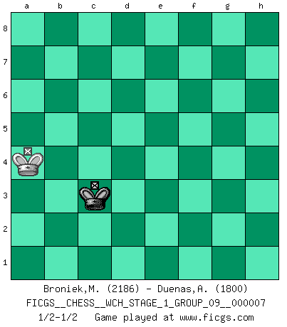 Last move : 1/2-1/2 2010 January 17 18:16:21 [Event "FICGS__CHESS__WCH_STAGE_1_GROUP_09__000007"] [Site "FICGS"] [Date "2009.11.02"] [Round "1"] [White "Broniek,Mariusz Maciej"] [Black "Duenas,Alexis"] [Result "1/2-1/2"] [WhiteElo "2186"] [BlackElo "1800"] 1.e4 e6 2.d4 d5 3.Nc3 Bb4 4.e5 c5 5.a3 Bxc3+ 6.bxc3 Ne7 7.Qg4 Qc7 8.Qxg7 Rg8 9.Qxh7 cxd4 10.Ne2 Nbc6 11.f4 Bd7 12.Qd3 dxc3 13.Qxc3 Nf5 14.Rb1 O-O-O 15.Rg1 d4 16.Qd3 f6 17.g4 Nh4 18.exf6 e5 19.f7 Rxg4 20.Rxg4 Bxg4 21.Bh3 Qd7 22.Bxg4 Qxg4 23.Rb3 Nf5 24.Qh3 Qxh3 25.Rxh3 Rf8 26.fxe5 Nxe5 27.Bb2 Rxf7 28.Bxd4 Nxd4 29.Nxd4 Kc7 30.Ke2 a6 31.Rh6 Ng4 32.Rh4 Rf2+ 33.Ke1 Rg2 34.Rh7+ Kd6 35.Rg7 Ke5 36.c3 Ke4 37.h3 Ne3 38.Rxg2 Nxg2+ 39.Kd2 Ne3 40.h4 Nc4+ 41.Kc2 Nxa3+ 42.Kb3 Nb1 43.h5 Nd2+ 44.Kc2 Nc4 45.h6 Ne5 46.Ne6 Kf5 47.h7 Ng6 48.Nc5 Kf6 49.Nxb7 Kg7 50.Kd3 Kxh7 51.Na5 Kg7 52.Kd4 Kf6 53.Kd5 Ne7+ 54.Kd6 Nf5+ 55.Kc6 Ke5 56.Kb6 Nd6 57.Kxa6 Kd5 58.Kb6 Nc4+ 59.Kb5 Nxa5 60.Kxa5 Kc4 61.Ka4 Kxc3 1/2-1/2 French : Winawer, Advance, poisoned pawn variation Queenside Castling by player Black (move 14) 10 pieces endgame at move 38 : White KRNPPP , Black KNPP WHITE : King + 1 Rook 1 Knight 3 Pawns BLACK : King + 1 Knight 2 Pawns 9 pieces endgame at move 38 : White KNPPP , Black KNPP WHITE : King + 1 Knight 3 Pawns BLACK : King + 1 Knight 2 Pawns 8 pieces endgame at move 41 : White KNPP , Black KNPP WHITE : King + 1 Knight 2 Pawns BLACK : King + 1 Knight 2 Pawns 7 pieces endgame at move 49 : White KNPP , Black KNP WHITE : King + 1 Knight 2 Pawns BLACK : King + 1 Knight 1 Pawn 6 pieces endgame at move 50 : White KNP , Black KNP WHITE : King + 1 Knight 1 Pawn BLACK : King + 1 Knight 1 Pawn 5 pieces endgame at move 57 : White KNP , Black KN WHITE : King + 1 Knight 1 Pawn BLACK : King + 1 Knight 4 pieces endgame at move 59 : White KP , Black KN WHITE : King + 1 Pawn BLACK : King + 1 Knight 3 pieces endgame at move 60 : White KP , Black K WHITE : King + 1 Pawn BLACK : King + 2 pieces endgame at move 61 : White K , Black K WHITE : King + BLACK : King + This chess game ended in a draw. Follow this game move after move (download)Chess, like love, is infectious at any age. (Flohr) Bis zum Jahr 1971 verlief in meiner Schachkariere alles glatt. Dieses dramatische Match [Fischer-Taimanov 6:0] machte mein Leben zur Hölle. (Mark Taimanov) El ganar no lo es todo... pero el perder es nada. (Mednis) Je fais ceci parce que dans cinquante coups j'obtiendrai cela; je m'appelle Mikhail Moisevitch Botvinnik. (Botvinnik) If you lose the game you should win the analysis! (Proverb)