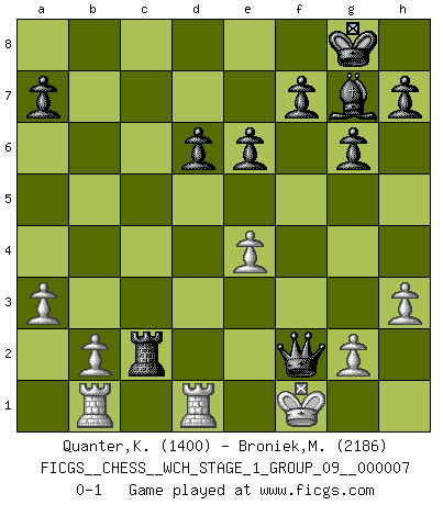 Last move : 0-1 2009 November 8 11:47:35 [Event "FICGS__CHESS__WCH_STAGE_1_GROUP_09__000007"] [Site "FICGS"] [Date "2009.11.02"] [Round "1"] [White "Quanter,Kirsty"] [Black "Broniek,Mariusz Maciej"] [Result "0-1"] [WhiteElo "1400"] [BlackElo "2186"] 1.e4 c5 2.Nf3 d6 3.d4 cxd4 4.Nxd4 Nf6 5.Bd3 g6 6.Be3 Bg7 7.c4 Ng4 8.h3 Nxe3 9.fxe3 Nc6 10.Nc3 Nxd4 11.exd4 Bxd4 12.Qa4+ Bd7 13.Qb3 Qa5 14.O-O-O Rc8 15.Nd5 b5 16.Kb1 e6 17.Nb4 bxc4 18.Bxc4 Ba4 19.Bb5+ Qxb5 20.Qd3 Bc2+ 21.Qxc2 Rxc2 22.Kxc2 Qxb4 23.Rb1 Bg7 24.Rhd1 O-O 25.a3 Rc8+ 26.Kd3 Qd4+ 27.Ke2 Rc2+ 28.Kf1 Qf2+ 0-1 Sicilian Queenside Castling by player White (move 14) Kingside Castling by player Black (move 24) Player Black won this chess game. Follow this game move after move (download)Even the laziest King flees wildly in the face of a double check ! (Aaron Nimzowitsch) Du musst nicht gut spielen, es reicht, wenn du besser spielst als dein Gegner. (Anonymous) La belleza de un movimiento no se refleja solo en su apariencia, sino en el pensamiento detrás de él. (Siegbert Tarrasch) Je ne suis pas le dernier à jouer lâchement des coups douteux pendant le zeïtnot de l'adversaire pour l'achever: en effet les coups qui font le plus peur sont ceux que l'on ne comprend pas. Je me fais souvent peur quand je joue. (Un professeur anonyme) Life is like a ten-speed bicycle: most of us have gears we never use. (Charles M. Schulz)