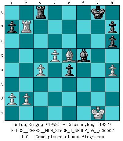 Last move : 1-0 2010 March 31 0:40:23 [Event "FICGS__CHESS__WCH_STAGE_1_GROUP_09__000007"] [Site "FICGS"] [Date "2009.11.02"] [Round "1"] [White "Golub,Sergey"] [Black "Cesbron,Guy"] [Result "1-0"] [WhiteElo "1995"] [BlackElo "1927"] 1.d4 e6 2.c4 f5 3.g3 Nf6 4.Nf3 Bb4+ 5.Bd2 Be7 6.Bg2 d6 7.O-O O-O 8.Nc3 Qe8 9.Qc2 Qh5 10.e4 e5 11.dxe5 dxe5 12.Nd5 Nxd5 13.exd5 Bf6 14.Bc3 Nd7 15.Rae1 e4 16.Nd4 Ne5 17.f3 Qh6 18.fxe4 Ng4 19.h4 Ne3 20.Qd2 Nxf1 21.Qxh6 gxh6 22.e5 Bxe5 23.Rxe5 Nxg3 24.Bb4 Rd8 25.Nb5 Bd7 26.Nxc7 Rab8 27.Be7 Rdc8 28.Bd6 Ne4 29.Bxe4 fxe4 30.Re7 Bf5 31.Be5 Rxc7 32.Rxc7 Rc8 33.Rxb7 1-0 Queen's pawn Kingside Castling by player White (move 7) Kingside Castling by player Black (move 7) Player White won this chess game. Follow this game move after move (download)Fischer was a master of clarity and a king of artful positioning. His opponents would see where he was going but were powerless to stop him. (Bruce Pandolfini) Kein Schachspieler kann gut schlafen. (H. G. Wells) La esencia del Ajedrez es pensar acerca de lo que el Ajedrez es. (David Bronstein) Comme les marins qui ont mille raisons différentes d'aller en mer, les joueurs d'échecs en ont tout autant avant de s'installer devant une table et jouer... (Vincent Bertignac, philosophe) Wikichess, chess moves explained by 'experimented' players. (Thibault de Vassal)