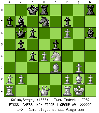 Last move : 1-0 2010 February 8 8:24:56 [Event "FICGS__CHESS__WCH_STAGE_1_GROUP_09__000007"] [Site "FICGS"] [Date "2009.11.02"] [Round "1"] [White "Golub,Sergey"] [Black "Turu,Indrek"] [Result "1-0"] [WhiteElo "1995"] [BlackElo "1728"] 1.d4 d5 2.c4 c6 3.Nf3 Nf6 4.Nc3 e6 5.Bg5 dxc4 6.e4 b5 7.e5 h6 8.Bh4 g5 9.Nxg5 hxg5 10.Bxg5 Nbd7 11.g3 Qb6 12.exf6 Bb7 13.Bg2 O-O-O 14.O-O Bh6 15.Be3 e5 16.Ne4 1-0 This chess game has been lost on time (started : 2009.11.02 22:27:34) QGD Slav : 4.Nc3 Queenside Castling by player Black (move 13) Kingside Castling by player White (move 14) Player White won this chess game. Follow this game move after move (download)You are for me the Queen on d8 and I am the Pawn on d7 !! (Eduard Gufeld) Ich hatte Zahnschmerzen im ersten Spiel. In der zweiten Partie tat mir der Kopf weh. In der dritten war es eine Rheuma-Attacke und während der vierten fühlte ich mich nicht gut. Und in der fünften? Nun, man muss doch nicht jedes Spiel gewinnen, oder? (Savielly Grigorievitsch Tartakower) Me siento como si fuera una pieza en una partida de Ajedrez, cuando mi oponente me indica: esa pieza no puede ser movida. (Soren Kierkegaard) Fischer est le meilleur joueur du monde et Karpov n'est qu'un joueur de bistrot. (Garry Kasparov, agé de 16 ans) Good luck. You're gonna need it. (Han Solo in Star Wars ep.6)