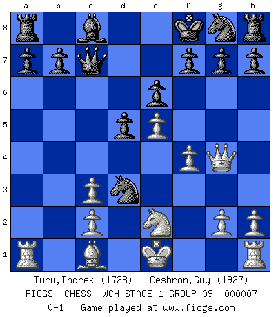 Last move : 0-1 2010 January 1 8:18:25 [Event "FICGS__CHESS__WCH_STAGE_1_GROUP_09__000007"] [Site "FICGS"] [Date "2009.11.02"] [Round "1"] [White "Turu,Indrek"] [Black "Cesbron,Guy"] [Result "0-1"] [WhiteElo "1728"] [BlackElo "1927"] 1.e4 e6 2.d4 d5 3.Nc3 Bb4 4.e5 c5 5.a3 cxd4 6.axb4 dxc3 7.Qg4 Kf8 8.Bd3 Qc7 9.f4 Nc6 10.Ne2 Nxb4 11.bxc3 Nxd3+ 0-1 This chess game has been lost on time (started : 2009.11.02 22:27:34) French : Winawer, Advance, 5.a3 Player Black won this chess game. Follow this game move after move (download)Chess is no whit inferior to the violin, and we have a large number of professional violinists. (Mikhail Botvinnik) Im Schach nämlich geht es darum, daß Ich des Gegners klein zu kriegen, sein Ego zu zerbrechen und zu zermahlen, seine Selbstachtung zu zertreten und zu verscharren und seine ganze mißachtenswerte sogenannte Persönlichkeit ein für alle Mal tot zu hacken und zu zerstampfen und dadurch die menschliche Gesellschaft von einer stinkenden Pestbeule zu befreien. Es ist ein königliches Spiel. (Robert James Fischer) Siempre es mucho mejor sacrificar las piezas de tu oponente. (Savielly Tartakover) Le thème de l'attaque double intervient d'une manière ou d'une autre dans l'immense majorité des combinaisons. (Youri Averbakh) Mac users swear by their computers. PC users swear at their computers. (Author unknown)