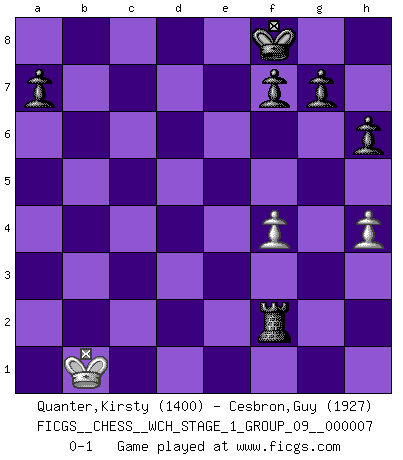 Last move : 0-1 2009 December 22 19:3:17 [Event "FICGS__CHESS__WCH_STAGE_1_GROUP_09__000007"] [Site "FICGS"] [Date "2009.11.02"] [Round "1"] [White "Quanter,Kirsty"] [Black "Cesbron,Guy"] [Result "0-1"] [WhiteElo "1400"] [BlackElo "1927"] 1.e4 e6 2.d4 d5 3.exd5 exd5 4.Nc3 Bb4 5.a3 Bxc3+ 6.bxc3 Nf6 7.c4 O-O 8.Bg5 Re8+ 9.Be2 dxc4 10.Nf3 h6 11.Bxf6 Qxf6 12.O-O c3 13.d5 c6 14.dxc6 Nxc6 15.Bb5 Bg4 16.Bxc6 Qxc6 17.h3 Bxf3 18.Qxf3 Qxf3 19.gxf3 Re2 20.Ra2 Rae8 21.Kg2 Rd2 22.h4 R8e2 23.Kg3 Rxc2 24.Rxc2 Rxc2 25.f4 Ra2 26.Rc1 Rxa3 27.Kg4 b5 28.Kf5 b4 29.Ke4 Ra2 30.Rb1 c2 31.Rc1 b3 32.Kd3 b2 33.Kxc2 bxc1Q+ 34.Kxc1 Kf8 35.Kb1 Rxf2 0-1 French : Exchange variation Kingside Castling by player Black (move 7) Kingside Castling by player White (move 12) Promotion Queen by player Black (move 33) 10 pieces endgame at move 34 : White KPPP , Black KRPPPP WHITE : King + 3 Pawns BLACK : King + 1 Rook 4 Pawns 9 pieces endgame at move 35 : White KPP , Black KRPPPP WHITE : King + 2 Pawns BLACK : King + 1 Rook 4 Pawns Player Black won this chess game. Follow this game move after move (download)It is not enough to be a good player... you must also play well. (Siegbert Tarrasch) Wenn Dein Gegner dir ein Remis anbietet, versuch herauszufinden, weshalb er glaubt schlechter zu stehen. (Nigel Short) El sobresalir en el Ajedrez es un signo de una mente intrigante. (Sir Arthur Conan Doyle) Des points faibles ou des trous dans la position de l'adversaire doivent être occupés par des pièces et non pas par des pions. (Siegbert Tarrasch) Optimism is a variety of information deficit. Sometimes especially true for correspondence chess games. (Michael Aigner)
