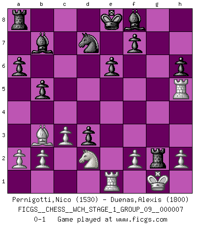 Last move : 0-1 2010 February 9 20:26:8 [Event "FICGS__CHESS__WCH_STAGE_1_GROUP_09__000007"] [Site "FICGS"] [Date "2009.11.02"] [Round "1"] [White "Pernigotti,Nico"] [Black "Duenas,Alexis"] [Result "0-1"] [WhiteElo "1530"] [BlackElo "1800"] 1.e4 e6 2.Nf3 d5 3.d4 dxe4 4.Ne5 Nf6 5.Bc4 c5 6.O-O Qxd4 7.Qxd4 cxd4 8.c3 d3 9.Bg5 a6 10.Nd2 b5 11.Rfe1 h6 12.Bxf6 gxf6 13.Rxe4 fxe5 14.Bb3 Bb7 15.Rxe5 Nd7 16.Rh5 Rg8 17.Re1 Rxg2+ 0-1 This chess game has been lost on time (started : 2009.11.02 22:27:34) French defense Kingside Castling by player White (move 6) Player Black won this chess game. Follow this game move after move (download)A man without frontiers. He didn't divide the East and the West, he brought them together in their admiration for him. (Ljubomir Ljubojevic, about Bobby Fischer's death) Ich moechte nie einem Club beitreten, der Leute wie mich als Mitglieder aufnimmt. (Woody Allen) La maestría del Ajedrez consiste esencialmente en analizar posiciónes de Ajedrez con precisión. (Mikhail Botvinnik) Toutes les manuvres exécutées sur une colonne ouverte ont pour but ultime l'intrusion définitive sur la septième ou la huitième rangée, en plein cur de la position ennemie. (Aaron Nimzovitch) The smarter you play, the luckier you'll be. (Mark Pilarski)
