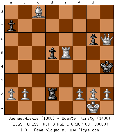 Last move : 1-0 2009 November 4 16:34:10 [Event "FICGS__CHESS__WCH_STAGE_1_GROUP_09__000007"] [Site "FICGS"] [Date "2009.11.02"] [Round "1"] [White "Duenas,Alexis"] [Black "Quanter,Kirsty"] [Result "1-0"] [WhiteElo "1800"] [BlackElo "1400"] 1.d4 g6 2.c4 e6 3.Nc3 Bg7 4.Nf3 b6 5.e4 c5 6.Nb5 d5 7.Bf4 Na6 8.Ng5 h6 9.Nd6+ Kf8 10.Ngxf7 Qf6 11.Be5 Qe7 12.Nxh8 Bxh8 13.Nxc8 Rxc8 14.Bxh8 Nf6 15.cxd5 exd5 16.Bxf6 Qxf6 17.Bxa6 Re8 18.O-O Rxe4 19.dxc5 Rd4 20.Qc1 bxc5 21.Qxc5+ Kg8 22.Rac1 Rd2 23.Qc8+ Kg7 24.Rc7+ Qf7 25.Rxf7+ Kxf7 26.Re1 Kf6 27.Qf8+ Kg5 28.Re5+ Kg4 29.Bc8+ Kh4 30.Qxh6+ 1-0 Modern defense Kingside Castling by player White (move 18) Player White won this chess game. Follow this game move after move (download)Chess is thirty to forty percent psychology. You don't have this when you play a computer. I can't confuse it. (Judith Polgar) Das Schachspiel ist ein See, in welchem eine Mücke baden und ein Elefant ertrinken kann. (Emanuel Lasker) Fischer era un maestro de claridad y un Rey del posicionamiento astuto. Sus oponentes podían ver hacia donde se dirigía pero eran impotentes para detenerlo. (Bruce Pandolfini) Pour moi, les échecs ne sont pas un jeu mais un art. (Alexandre Alekhine) I take risks, sometimes patients die, but not taking risks causes more patients to die. So I guess my biggest problem is I've been cursed with the ability to do the math. (Gregory House, House M.D.)