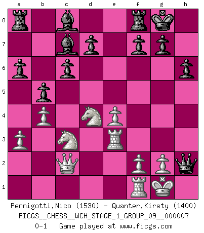 Last move : 0-1 2009 December 11 10:25:37 [Event "FICGS__CHESS__WCH_STAGE_1_GROUP_09__000007"] [Site "FICGS"] [Date "2009.11.02"] [Round "1"] [White "Pernigotti,Nico"] [Black "Quanter,Kirsty"] [Result "0-1"] [WhiteElo "1530"] [BlackElo "1400"] 1.e4 e5 2.Nf3 Nc6 3.Bb5 a6 4.Ba4 b5 5.Bb3 Nf6 6.O-O Bc5 7.c3 O-O 8.d4 exd4 9.cxd4 Bb6 10.Bg5 h6 11.Bxf6 Qxf6 12.Nc3 Nb4 13.a3 Nc6 14.Qe2 Nxd4 15.Qd1 Nxb3 16.Qxb3 c6 17.Rae1 Qe6 18.Qc2 Ba5 19.b4 Bc7 20.Nd4 Qe5 21.Re3 Qxh2+ 0-1 Ruy Lopez : Caro variation Kingside Castling by player White (move 6) Kingside Castling by player Black (move 7) Player Black won this chess game. Follow this game move after move (download)Only sissies Castle. (Rob Sillars) Schach ist ein Kampf gegen den Fehler. (Johannes Herrman Zukertort) Dios mío, Bobby Fischer juega tan simple. (Alexei Suetin) Psychologiquement, tu dois avoir confiance en toi même, mais cette confiance doit être basée sur des faits. (Robert Fischer) First of all, we have to go back to the classical time control. (Anatoly Karpov)