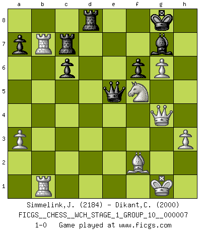 Last move : 1-0 2009 November 12 20:2:20 [Event "FICGS__CHESS__WCH_STAGE_1_GROUP_10__000007"] [Site "FICGS"] [Date "2009.11.03"] [Round "1"] [White "Simmelink,Joop"] [Black "Dikant,Christophe"] [Result "1-0"] [WhiteElo "2184"] [BlackElo "2000"] 1.e4 g6 2.d4 Bg7 3.Nc3 c6 4.f4 d5 5.e5 h5 6.Be3 Nh6 7.Nf3 Bg4 8.h3 Bxf3 9.Qxf3 Nf5 10.Bf2 h4 11.Bd3 e6 12.O-O Na6 13.a3 Qb6 14.Ne2 Bf8 15.c4 Qd8 16.cxd5 Qxd5 17.Be4 Qd7 18.Rac1 Rc8 19.b4 Be7 20.b5 Nb8 21.bxc6 bxc6 22.Rb1 O-O 23.Rb3 Qc7 24.Rfb1 Qa5 25.Bxf5 exf5 26.g4 hxg3 27.Nxg3 Rfd8 28.Nxf5 Bf8 29.Nh4 Nd7 30.Qg4 Bg7 31.f5 Nxe5 32.dxe5 Qxe5 33.fxg6 f6 34.Rb7 Rc7 35.Nf5 1-0 Robatsch defense : Gurgenidze variation Kingside Castling by player White (move 12) Kingside Castling by player Black (move 22) Player White won this chess game. Follow this game move after move (download)In Fischer's hands, a slight theoretical advantage is as good a being a Queen ahead. (Isaac Kashdan) Irgendwie scheint mir sonntags früh um 9 Uhr der Killerinstinkt verloren gegangen zu sein. (Alexej Shirov) No hay precio que no valga la pena por la cabellera del Rey enemigo. (Koblentz) Botvinnik disait en comparant les échecs à la musique: Il existe une science dont le but est l'étude de l'acoustique et des sons. Mais il y a aussi un art qui se sert de l'océan des sons : c'est la musique. De toute évidence, il en est de même pour la pensée. La logique est l'étude des lois de la réflexion et les échecs reflètent, en tant qu'art, le côté logique de la réflexion, sous la forme d'images artistiques... Extrait de Fischer - Spassky, Reykjavik 1972 par Alexander & F. Wyndham (Ed. Solar), p 37. Sometimes it pays to stay in bed in Monday, rather than spending the rest of the week debugging Monday's code. (Dan Salomon)